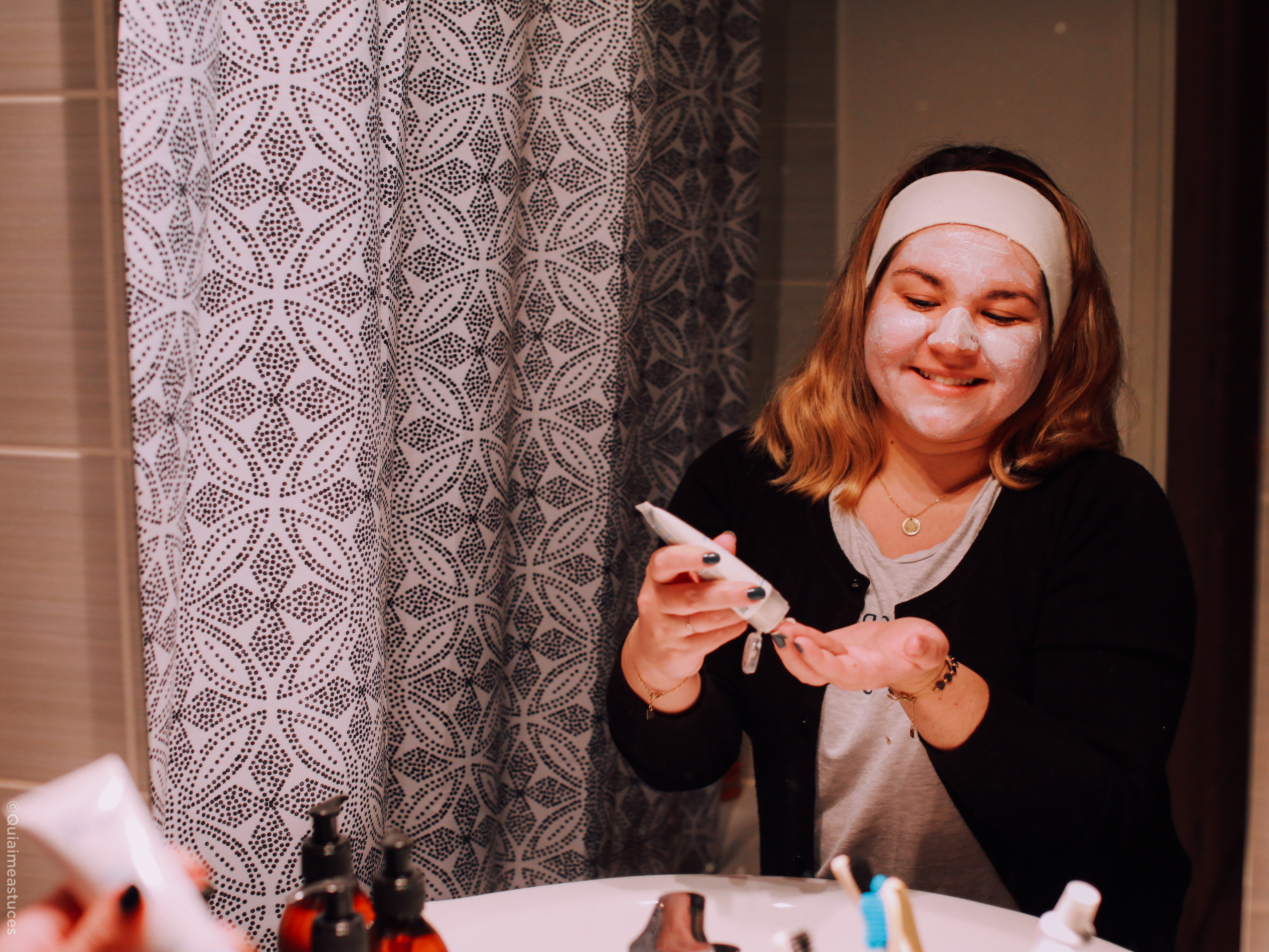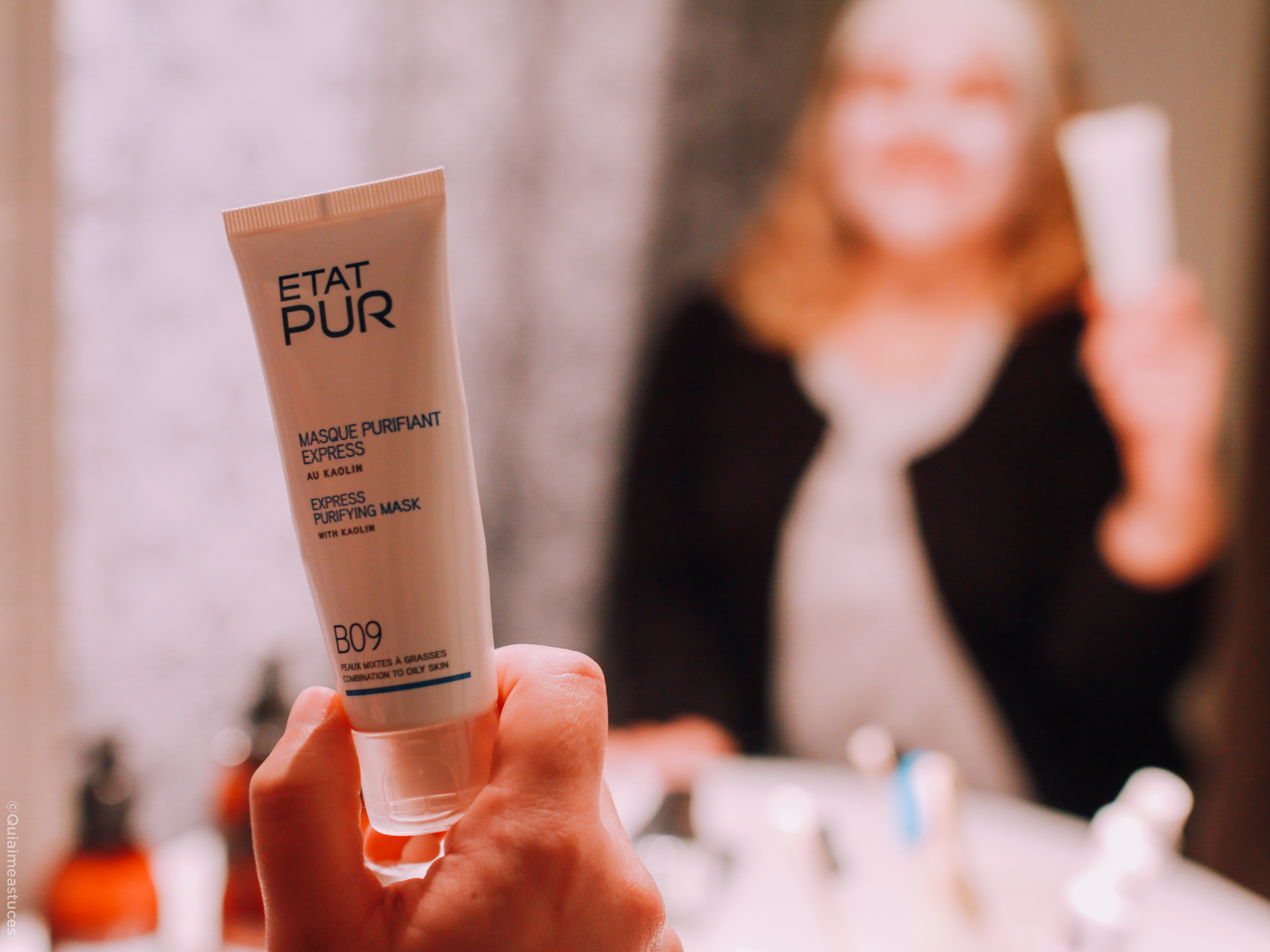 Il y a quelques semaines, j’ai eu le bonheur de faire un aller-retour sur Paris pour une masterclass avec la marque État Pur que je ne connaissais que de nom. Agréablement surprise par tout ce que j’ai appris sur la peau, l’acné ainsi que les bons gestes à adopter au quotidien. Nous sommes reparties avec un petit sac de goodies rempli de produits adaptés à notre peau. En l’occurence la mienne est décrit comme : peau avec un acné adulte, grasse sur la zone T et déshydratée sur les joues. Ma peau manque donc selon les zones d’eau et de gras. Dès la première utilisation de ce masque, j’ai senti ma peau plus douce, plus lisse et plus purifiée. Normalement les masques sur moi c’est soit le fiasco soit il faut plusieurs utilisations avant de voir un effet. Là, c’est un bonheur après l’avoir retiré ! J’applique ensuite ma crème hydratante (en ce moment également de chez État Pur, forcément ahah je teste les produits à fond ou si ma peau a des boutons la Phytosolution de chez Vichy + l’actif pur acide salicylique de État Pur). Vraiment, si votre peau a besoin d’un coup de pep’s purifiant en seulement 5 minutes, il est parfait sans être abrasif ou agressif, ça change ! Ma peau est vraiment plus jolie, plus nette et j’ai moins de boutons depuis que je l’utilise !