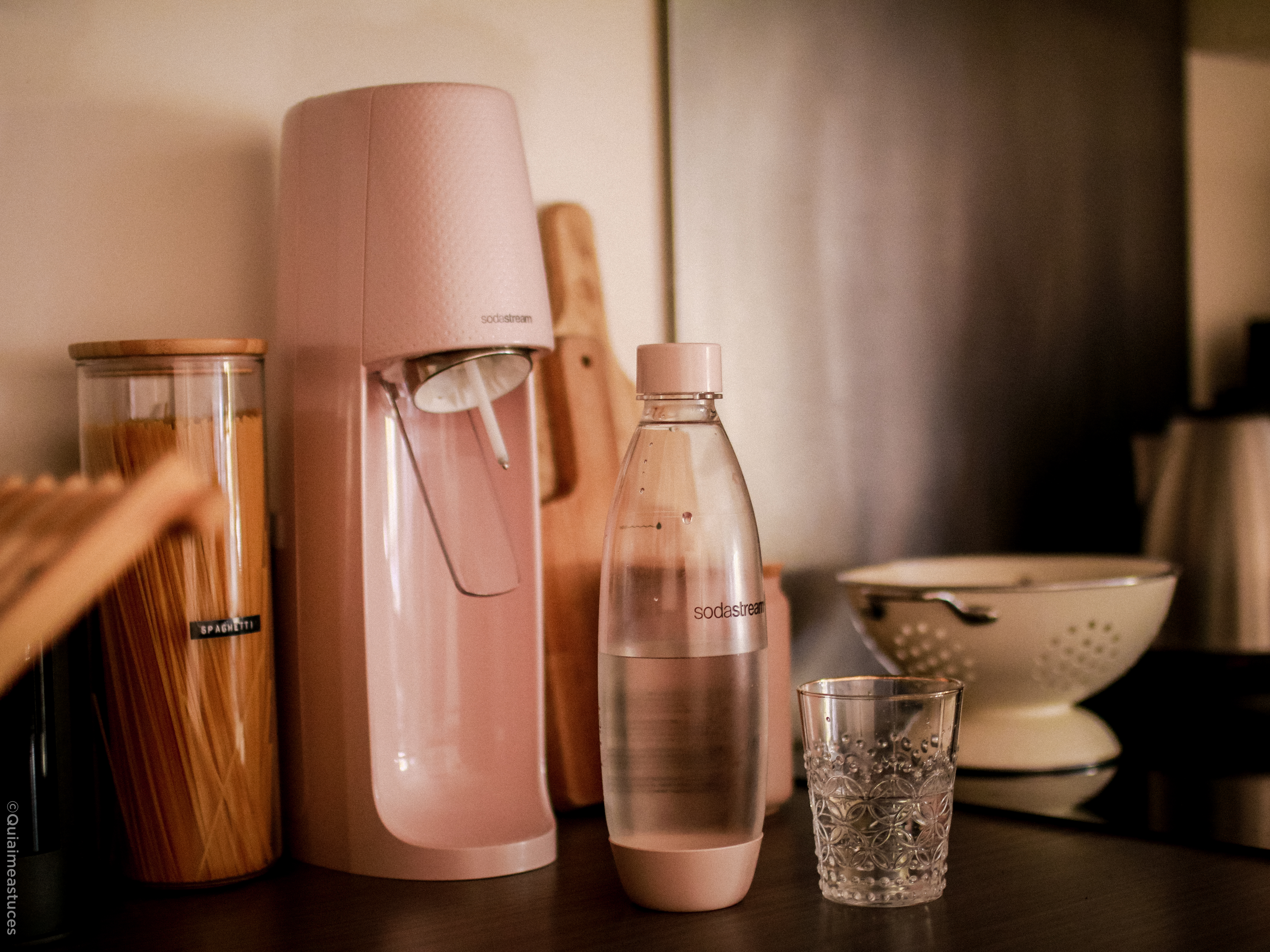 Un coup de coeur pratique au quotidien cette fois-ci ! Avec Boubou nous avons craqué pour la Sodastream en rose pastel il y a peu afin d’en finir avec les bouteilles en plastique. À la base, il n’est pas très eau pétillante à cause de ce, plus ou moins, léger goût de sel que certaines peuvent avoir. Avec la Sodastream, il n’a plus ce souci puisqu’il ne s’agit que d’eau. On peut aisément régler l’intensité des bulles et c’est super appréciable. Le kit se compose de la machine et fonctionne sans être branchée, ni sur batterie. Une bonbonne de gaz et hop’ le tour est joué ! En parlant de bonbonne, il est utile de préciser (merci Boubou pour le bon plan) qu’en ramenant la votre pour l’échanger contre une neuve, vous économisez 20€ sur le prix de cette dernière. Top ! C’est vraiment super pratique au quotidien et puis si ça peut nous éviter de jeter du plastique, c’est encore mieux. J’avoue avoir eu un coup de coeur supplémentaire pour la couleur. Je sais, c’est un détail, mais elle est vraiment trop canon ! Peur que le rose soit un chouilla trop « bonbon » et finalement agréablement surprise par ce vieux rose pastel qui se marie à merveille avec le bois et le verre de notre cuisine.