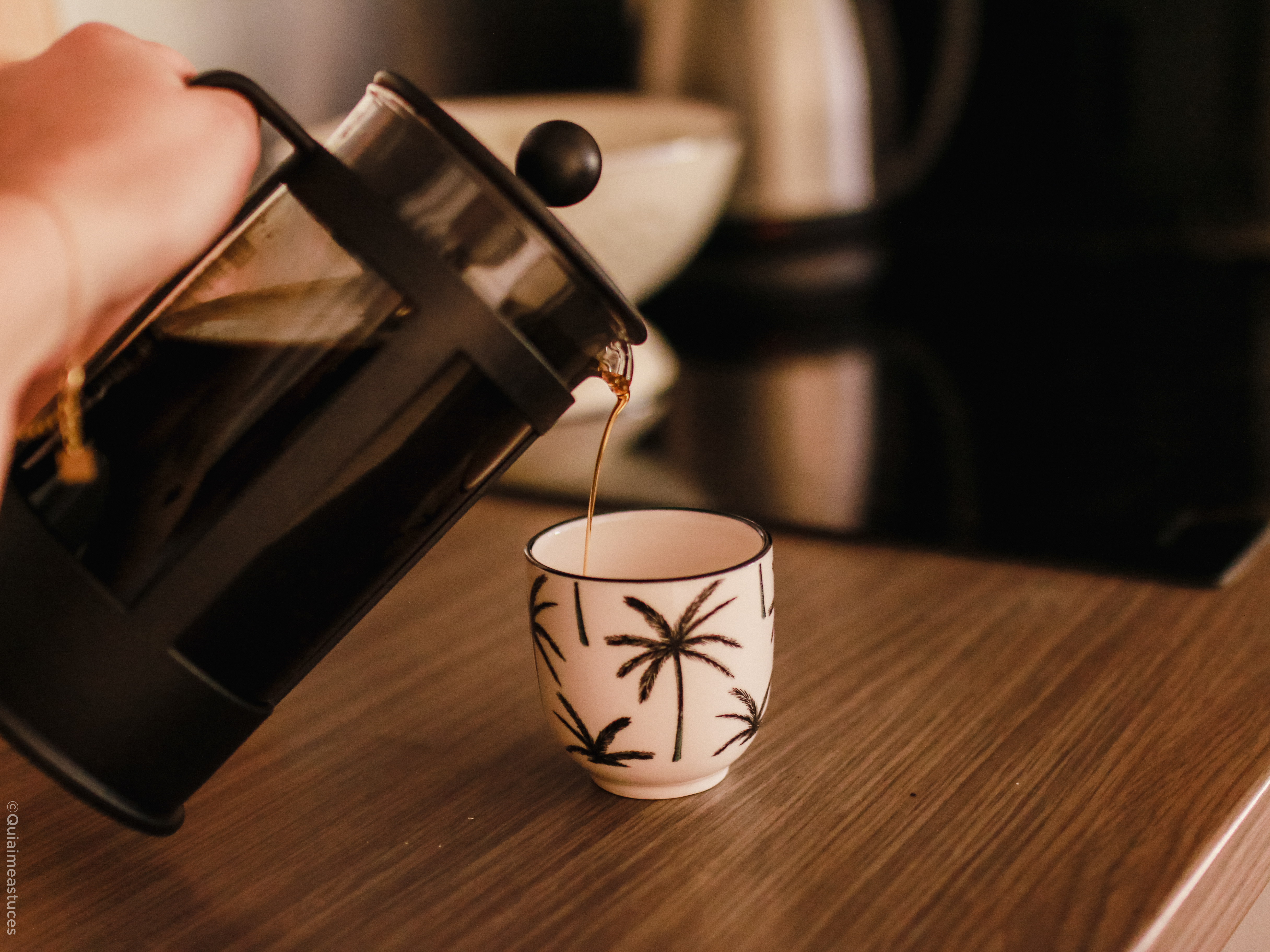 Alors là c’est THE découverte du mois ! Toujours dans l’optique de mieux consommer en jetant moins de déchets au quotidien, nous avons fait le choix d’opter pour cette petite machine à café manuelle de la marque Bodum. Pour seulement 19,90€ nous avons 6 tasses à café ce qui est largement suffisant. Là où nous devions utiliser une capsule / dosette par café par personne, par café avant de recevoir celle-ci. Alors loin de moi l’idée d’entrer dans un moule de perfection, mais si je peux faire attention jour après jour je trouve ça chouette. Quand je dis que nous ne sommes pas parfaits c’est surtout que, bon déjà personne ne l’est ahah, mais aussi puisque nous n’avons bien entendu pas jeter la machine à dosettes. Elle est toujours simplement beaucoup moins utilisée et nous la gardons pour les occasions comme les envies de cappuccinos, latte, macchiatos ou lorsque nos invités nous le demanderons. En tout cas celle-ci est un coup de coeur ! Facile à utiliser, on a rapidement pris nos habitudes. 6 cuillères dosées de café, un volume d’eau chaude non bouillante, on attend 4 minutes puis on appuie sur le piston pour écraser le marc de café. La seule contrainte est de choisir des grains pas trop moulus, mais ça il suffit juste de le savoir !