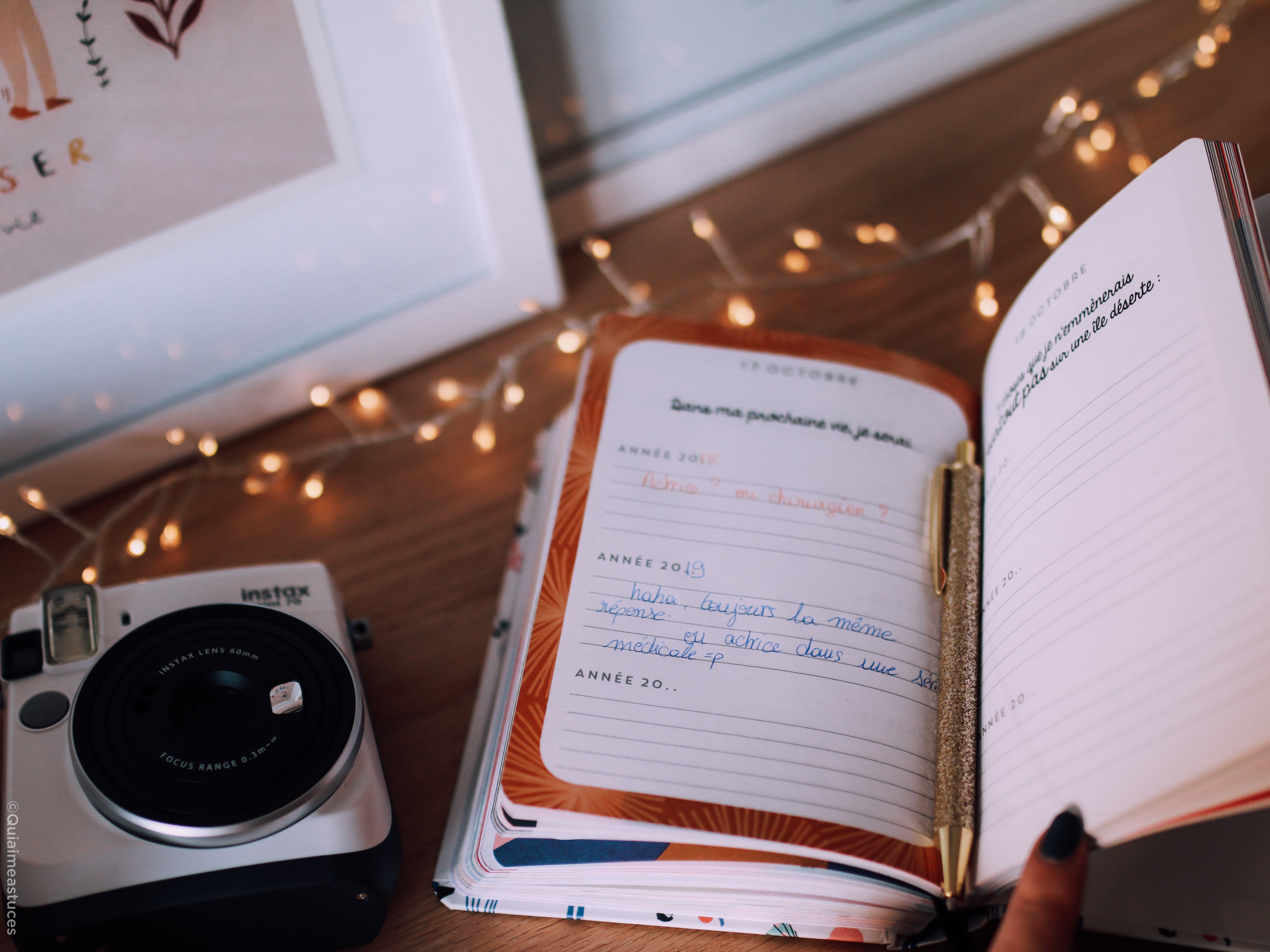 Ce livre est une réelle belle découverte ! Ça fait maintenant plus d’un an que j’ai et j’adore le remplir au quotidien. Bon, je dois avouer qu’il y a eu des petits oublis, mais je ne me mets aucune pression. Sur ma table de chevet ou dans mon salon selon mes humeurs pour écrire et hop ! La première année on découvre les questions, certaines très drôles, d’autres plus sérieuses. C’est cette année que les choses fun peuvent commencer ! Qu’est-ce que je ris en découvrant parfois mes réponses de l’an passé. Petit florilège de mes réponses :