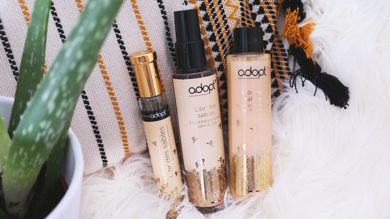 L’or des sables est la toute dernière collection Adopt’. Ils m’ont très gentillement envoyé la gamme composé d’une brume sans alcool (idéal pour l’été, aucun souci pour l’exposition au soleil ni pour la peau et les cheveux), une huile sèche pailletée (beaucoup trop cool quand je serai bronzée ahah) & pour finir l’eau de parfum qui est, entre nous, une MERVEILLE. Je vous le dit, c’est mon parfum pour ces 3 mois à venir ♥