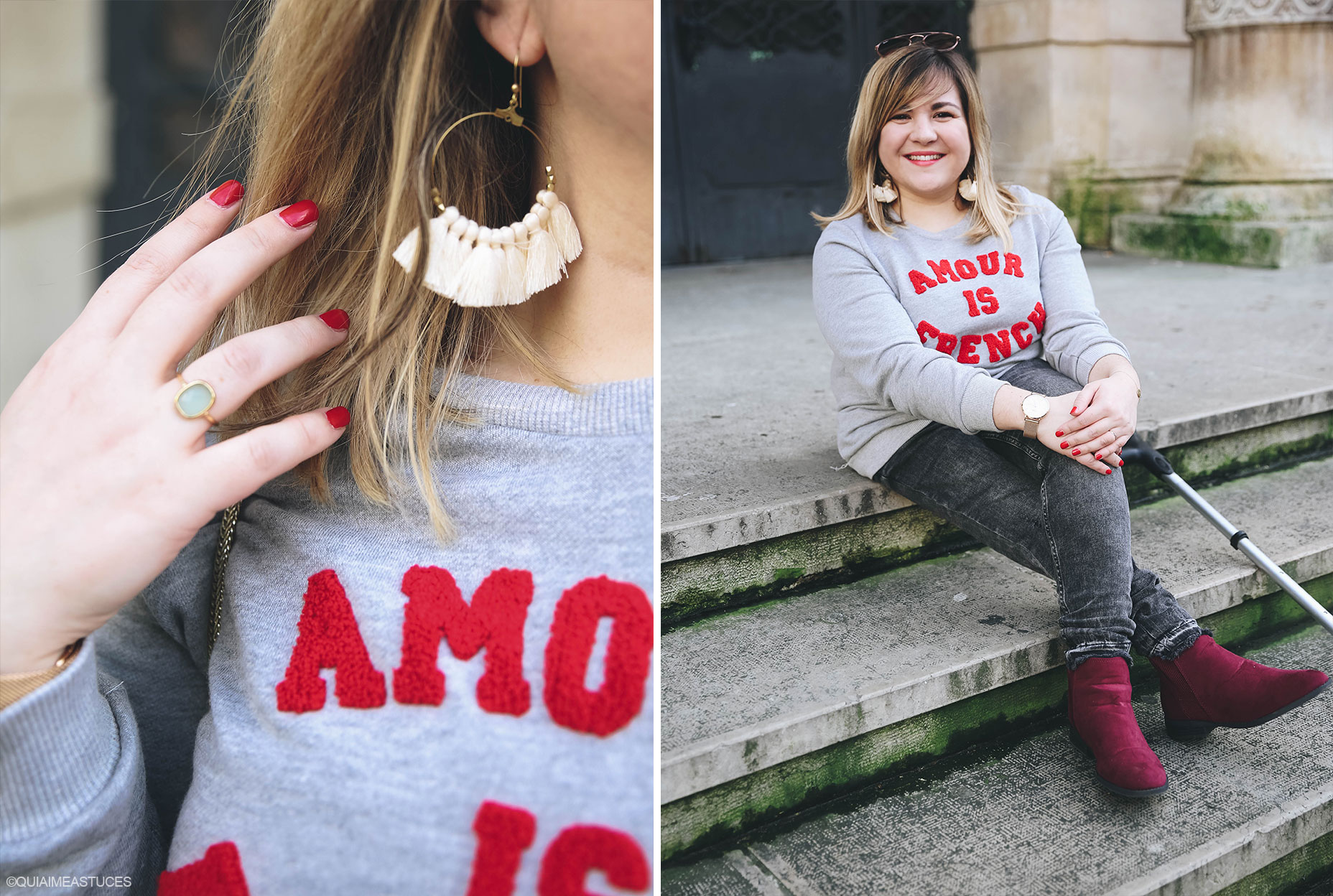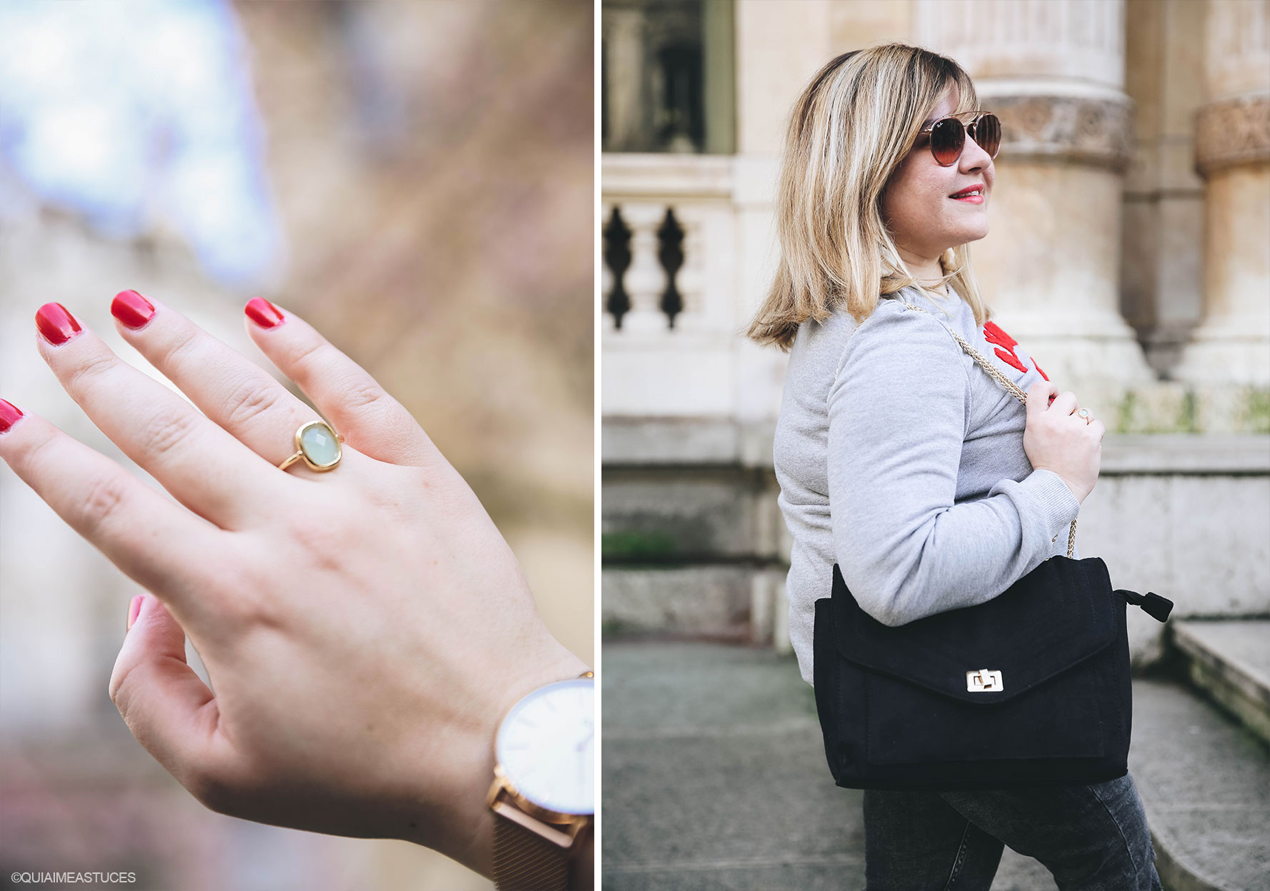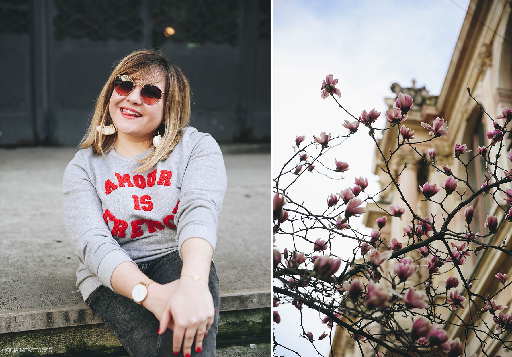 Côté accessoires j’adore les renouveler et dernièrement je n’ai pas pu résister en voyant ces boucles d’oreilles et cette bague chez Boutique Libertie. D’ailleurs, le sac aussi vient de cette boutique. Il m’a été offert à Noël par Boubou… j’en suis amoureuse et ne cesse de le porter depuis. Clairement je pourrai presque tout acheter chez eux. Mais je me calme, promis ! Les lunettes sont des Ray-Ban (cadeau de Noël, merci à mes parents) et les boots viennent de chez Primark (10€ les Chelsea boots, petits prix garantis). Je dirai qu’en règle générale, je ne suis pas une grande fan de sweat car je ne trouve pas qu’ils me mettent en valeur, mais il faut bien avouer que côté confort c’est le top. Je craque surtout pour le motif et le « slogan » d’un sweat et ce fut le cas avec celui-ci. 🙂