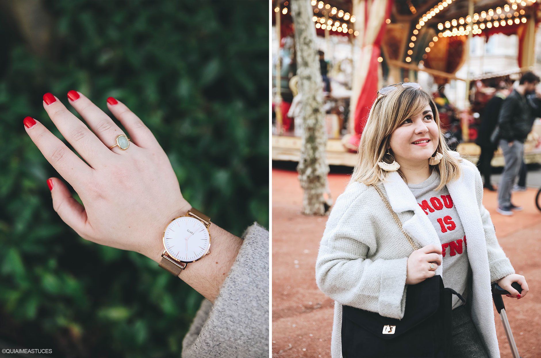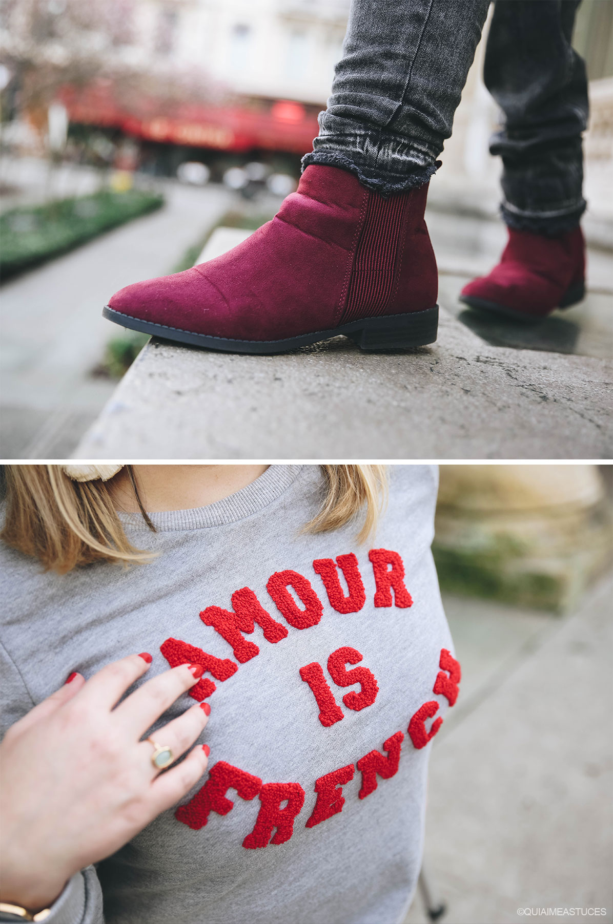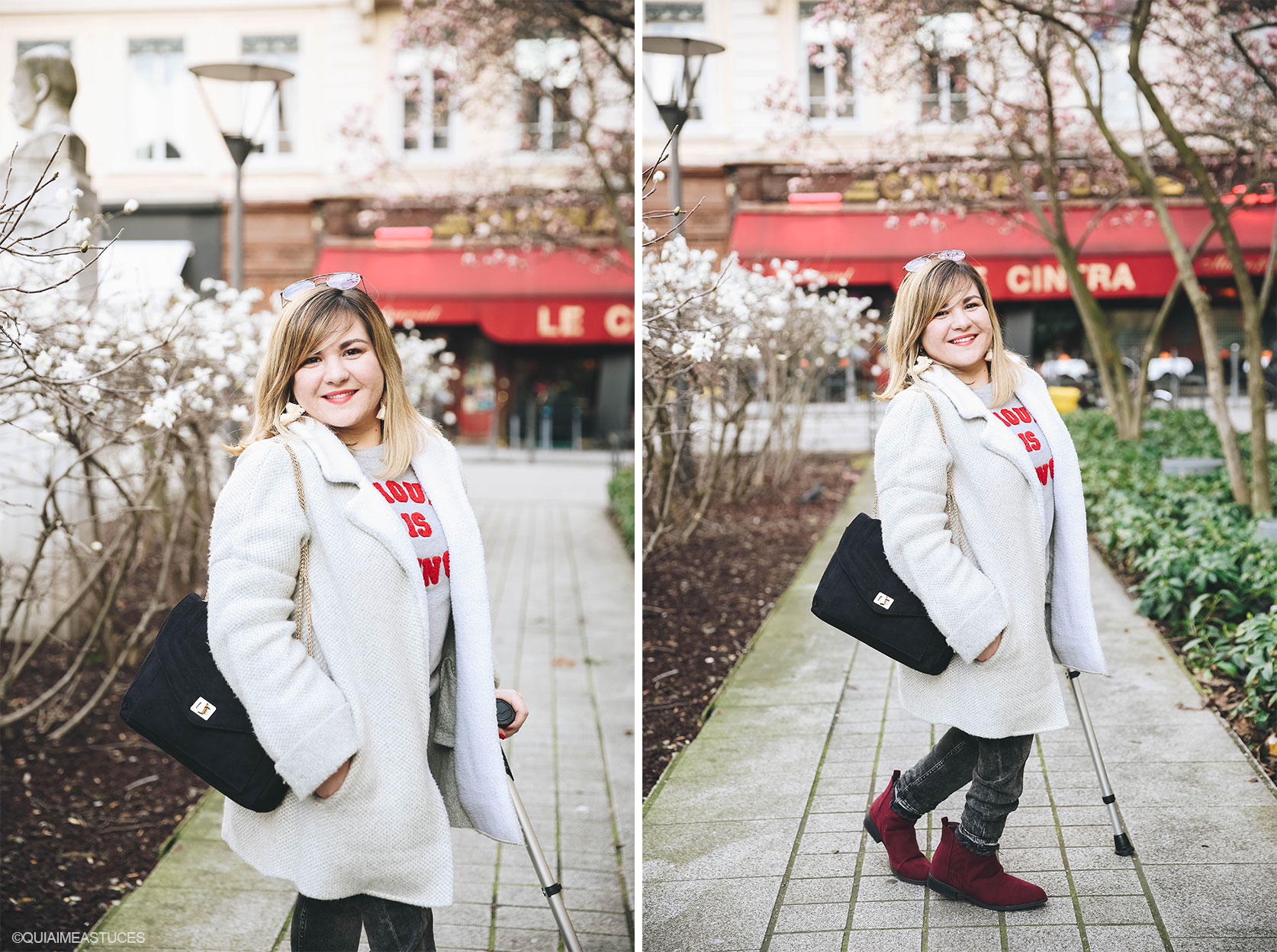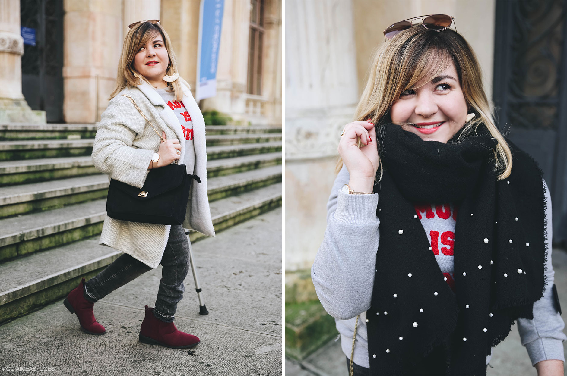 Côté accessoires j’adore les renouveler et dernièrement je n’ai pas pu résister en voyant ces boucles d’oreilles et cette bague chez Boutique Libertie. D’ailleurs, le sac aussi vient de cette boutique. Il m’a été offert à Noël par Boubou… j’en suis amoureuse et ne cesse de le porter depuis. Clairement je pourrai presque tout acheter chez eux. Mais je me calme, promis ! Les lunettes sont des Ray-Ban (cadeau de Noël, merci à mes parents) et les boots viennent de chez Primark (10€ les Chelsea boots, petits prix garantis). Je dirai qu’en règle générale, je ne suis pas une grande fan de sweat car je ne trouve pas qu’ils me mettent en valeur, mais il faut bien avouer que côté confort c’est le top. Je craque surtout pour le motif et le « slogan » d’un sweat et ce fut le cas avec celui-ci. 🙂