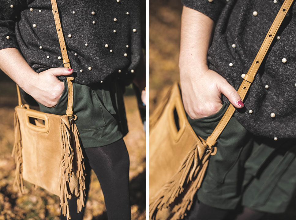 Hello hello ! J’espère que vous allez bien ? Pas trop froid ? Bon, c’est la bonne excuse pour ressortir nos écharpes et bonnets préférés en attendant Noël, mais je dois bien admettre qu’on se gèle un peu… Avant cette vague de froid, après avoir brunché avec les copains nous sommes allés nous balader afin de profiter de l’automne. Sa douceur, mais surtout de ses si jolies couleurs. J’en profite pour remercier Julien et ses clichés toujours magnifiques ! Ce look c’est mon coup de coeur de ces dernières semaines. Si je devais n’en choisir qu’un seul, il serait sûrement l’élu ahah. Ce petit pull tout doux à perles Zara ainsi que le short vert parfait pour la saison, de chez Zara également. Bien sûr vous commencez à me connaître, je ne peux sortir sans mon sac M de Maje surtout en automne. Il s’accorde avec tout c’est un vrai bonheur le matin avant de sortir : efficacité ! Et pour finir côté accessoires, mes boots Pimkie (collection de l’an dernier, mais je vous ai glissé tout plein d’alternatives / dupes dans l’article), mon chapeau Zara, et des lunettes de soleil Mango. C’était un dimanche parfait, comme je les aime. Entourée des copains, il faisait beau. Je veux ça tous les jours s’il vous plaît ahah 🙂 Et maintenant je lance (dans ma tête) le compte à rebour avant Noël. Je sais qu’il est encore un peu tôt, mais c’est plus fort que moi. Je commence à allumer des bougies « Pain d’épice », « Sapin » ou encore à faire des sablés à la cannelle. Vous aussi ? Rassurez moi, dîtes moi que je ne suis pas la seule #TeamNoël…