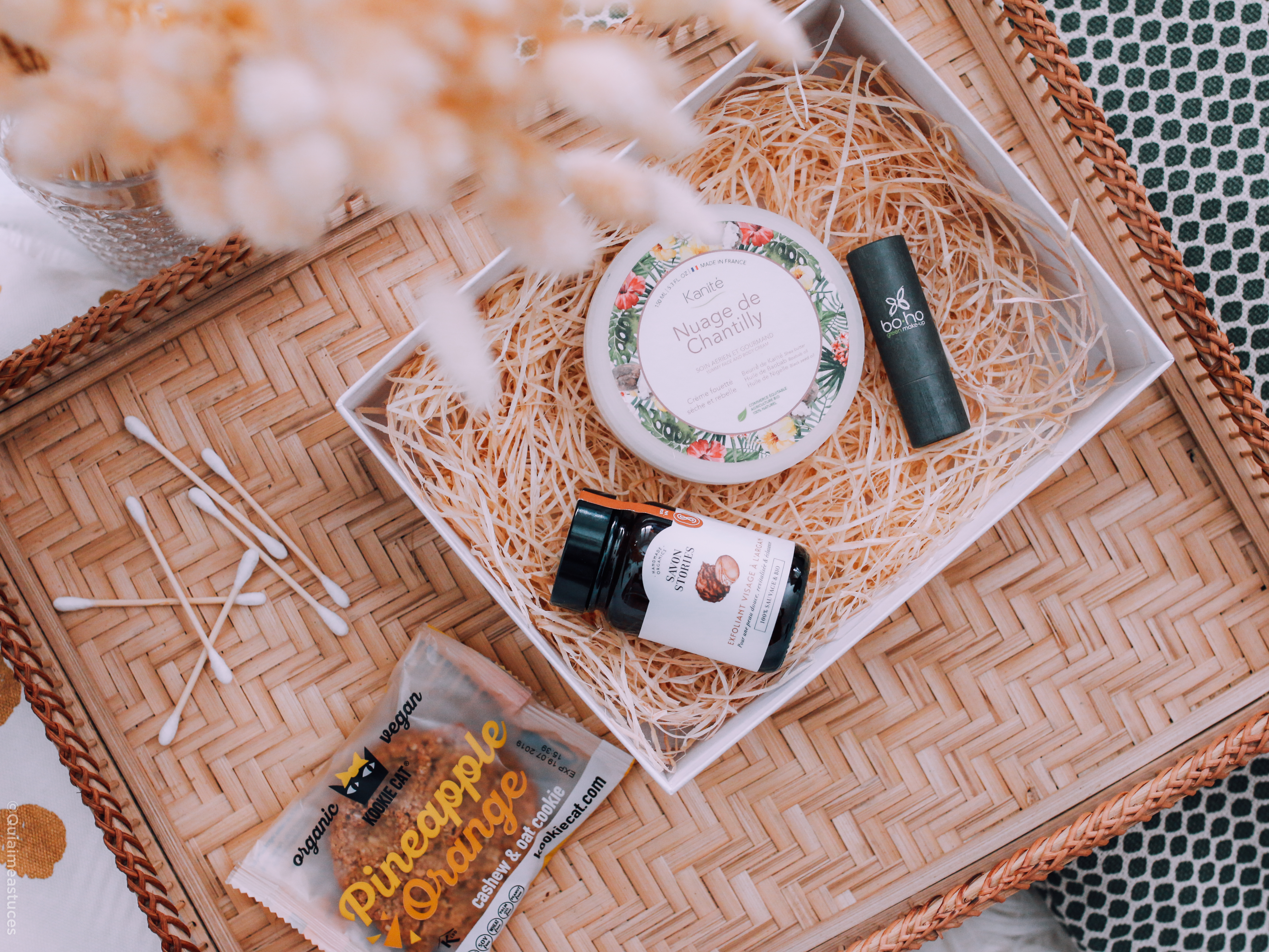 C’est une box mensuelle made in France (Annecy plus précisément), créé par Stéphanie et Romain, qui ne contient que des produits full size, 0 échantillon, bios, naturels et éthiques. J’ai trouvé le format très intéressant puisque chaque mois on part sur un modèle unique se composant de deux soins, un produit maquillage et une gourmandise. Autant vous dire que cette dernière ravie à chaque fois la gourmande qui est en moi ahah ! C’est vraiment hyper agréable de faire des découvertes de marques ou de produits qui me sont utiles au quotidien. Quand ça ne l’est pas forcément, car ça peut arriver, question de goût etc, les produits font le bonheur des copines ou même de Boubou !