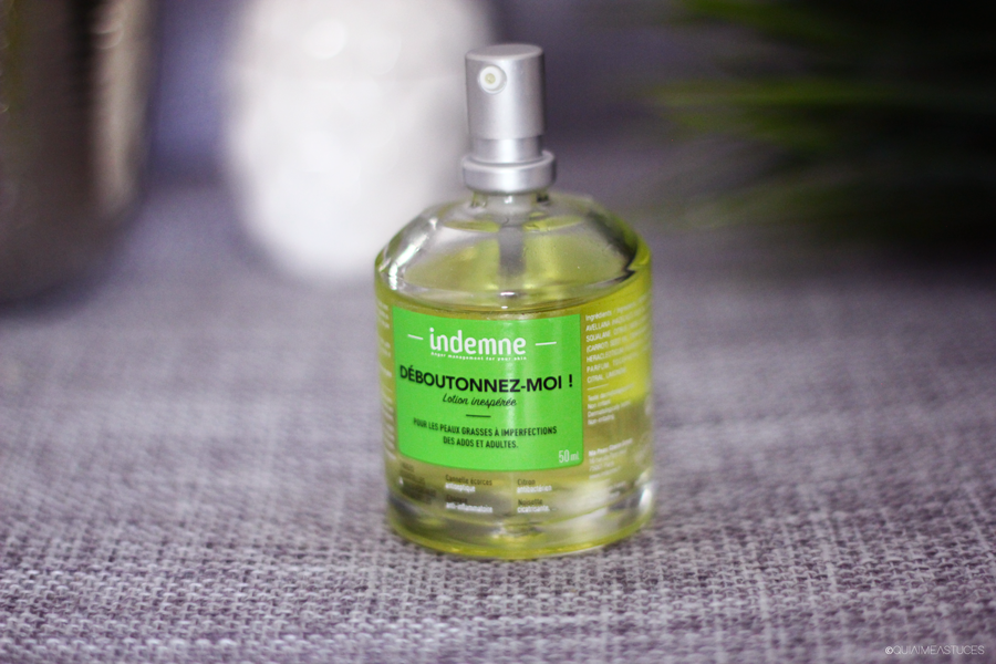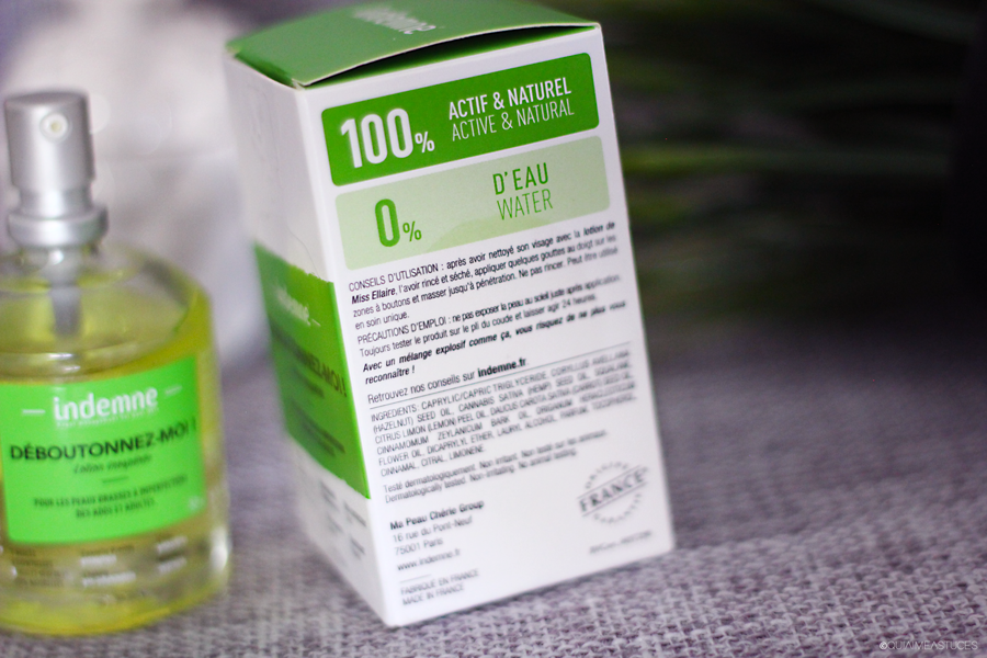 Bonjour bonjour vous ! J’espère que vous allez bien et que (attention point météo imminent) le retour du soleil vous fait plaisir. Bon, en même temps que celle qui me dise « perso, je préfère quand il pleut » lève la main tout de suite car je n’y crois pas beaucoup ahah. Comme vous le savez, il y a maintenant 2 mois, j’ai craqué pour me débarasser une fois de plus de mon acné. La dernière étape avant de retourner consulter un dermathologue. Je dois bien avouer qu’à bientôt 25 ans, c’est pas évident de me le trimballer encore sur la face comme si j’avais 14 ans… Je l’accepte tant bien que mal, puisqu’à l’évidence je n’ai pas tellement le choix. Mais en trainant sur mes blogs favoris, j’ai récemment vu des petits articles portant sur cette huile de chez Indemne qui porte le joli (et très attractif) nom de « Déboutonnez-moi !« . Stratégie marketing payante, puisqu’à la lecture des articles des copines blogueuses qui étaient plus que ravies de son efficacité, j’ai moi-même décidé de sauter le pas. Alors, bien sûr, chaque produit est différent selon les types de peaux. Je me suis dit qu’il était possible que ça ne marche pas sur moi, sur mon type d’acné, mais j’ai malgré tout voulu vérifier, curiosité quand tu nous tiens…