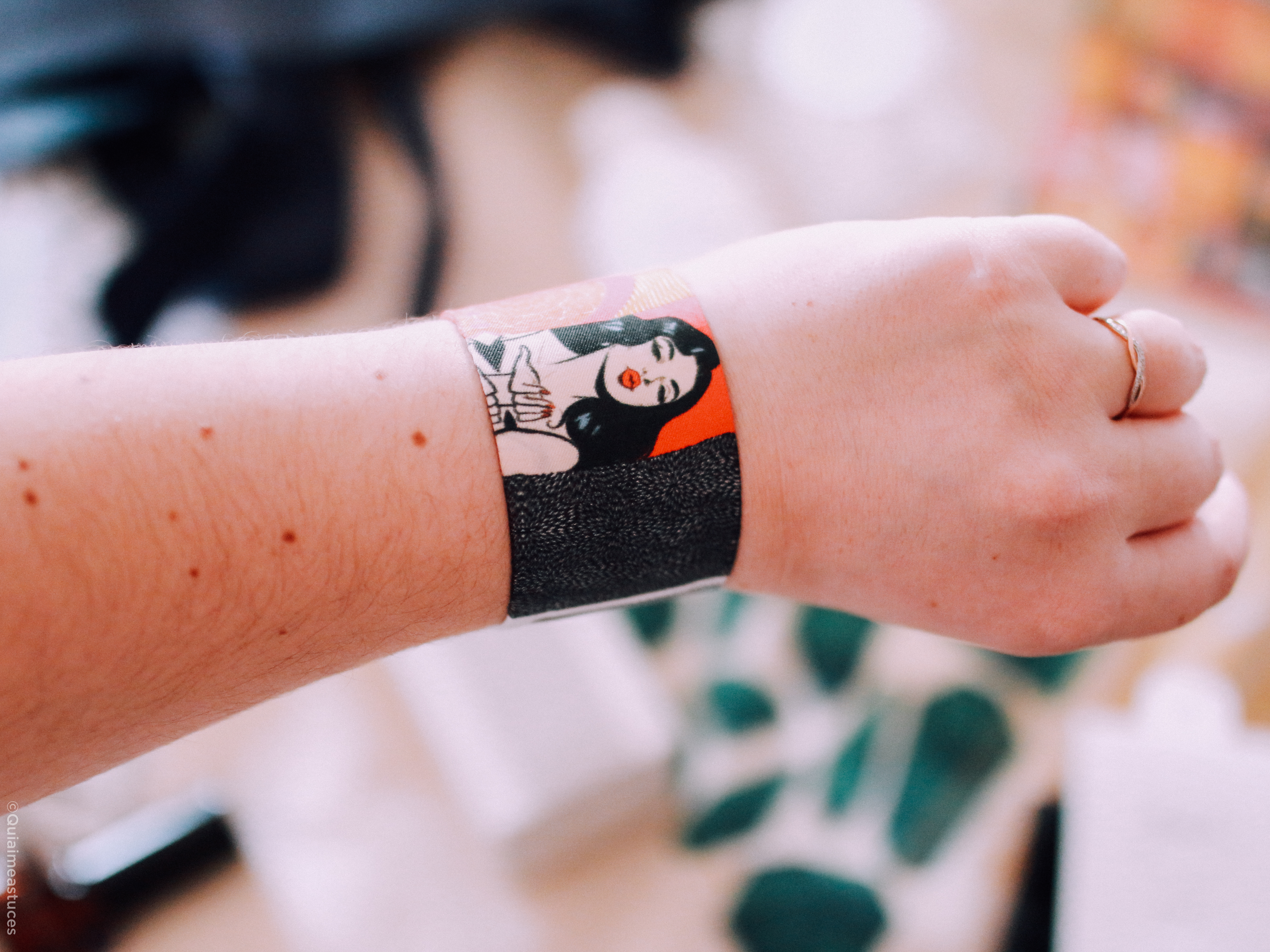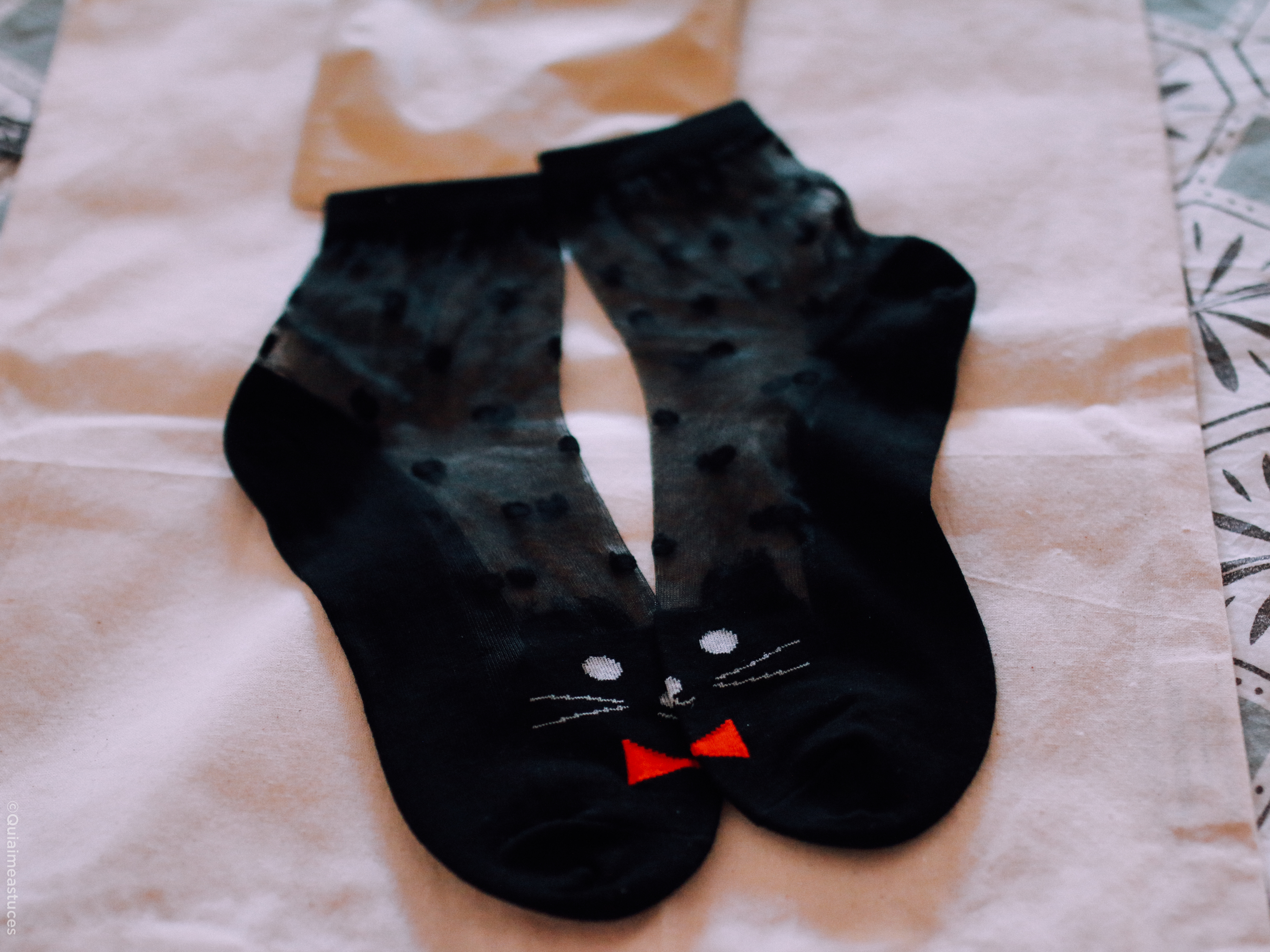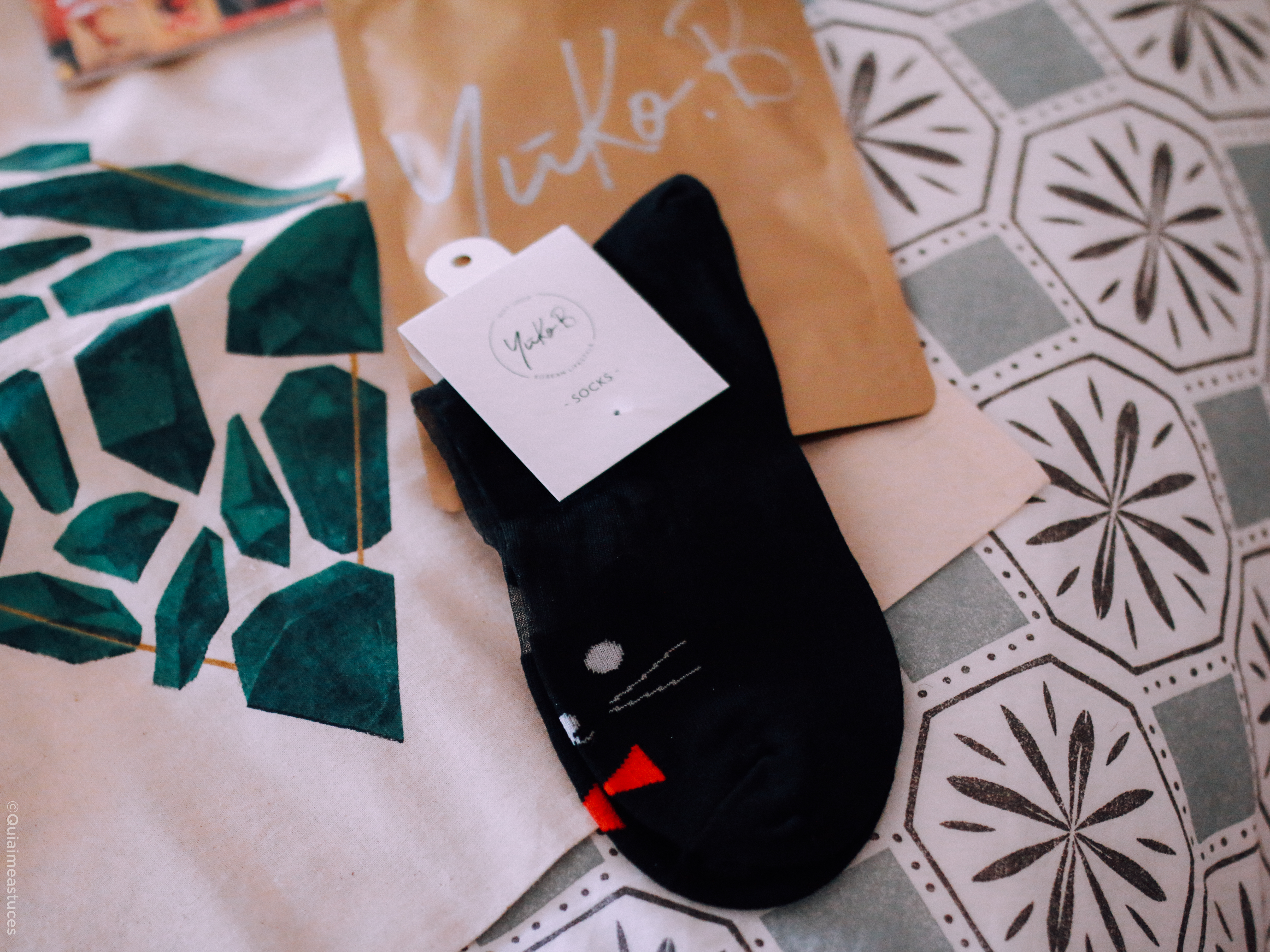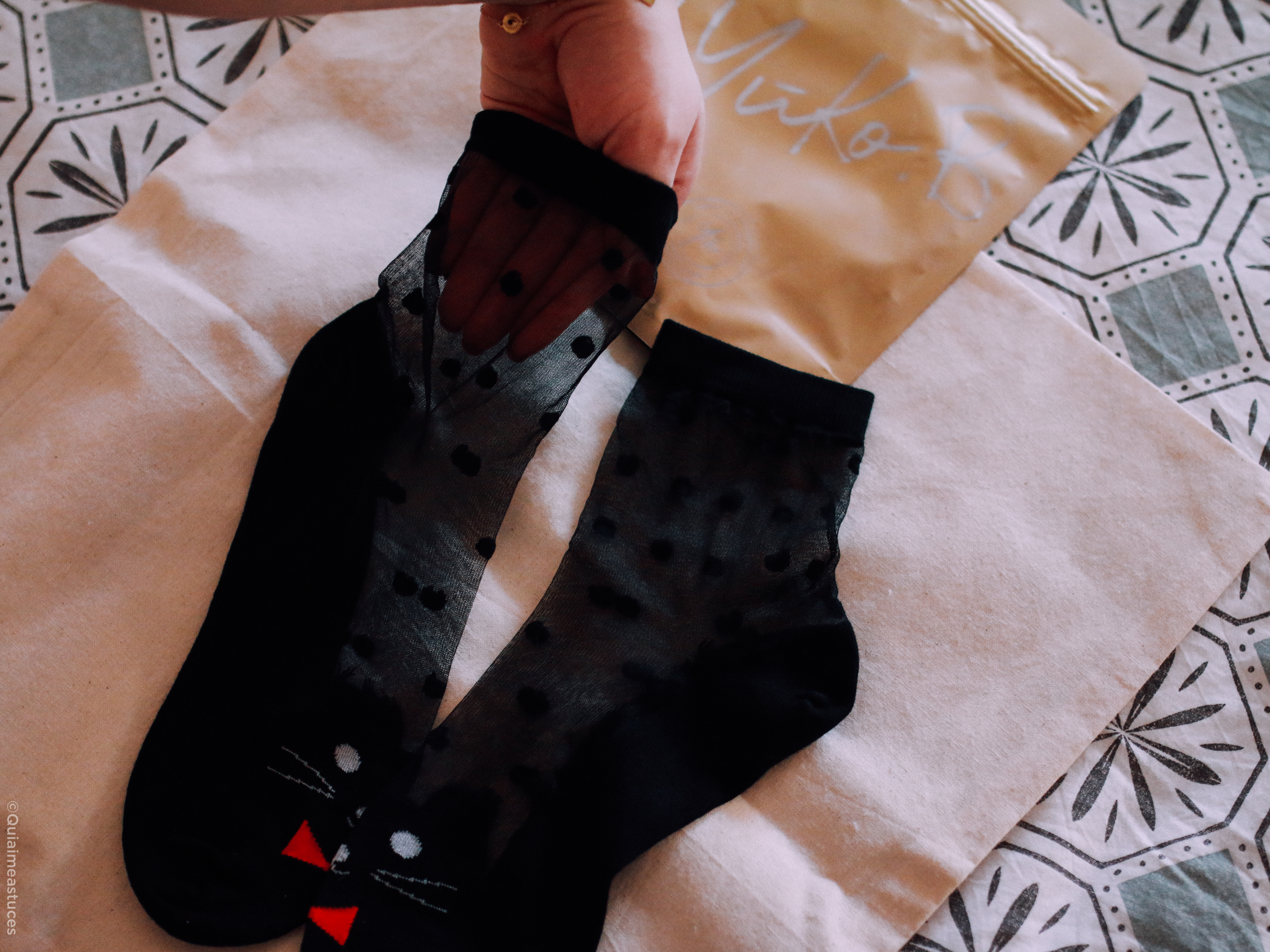Dans ma box découverte s’était glissé, cette jolie manchette en soie de la Soierie Lyonnaise Maison SAMS. Un bijou chic et coloré ! Ma maman a eu un coup de coeur, je vais lui donner avec grand plaisir 🙂 Allier haute couture accessible et matériaux de qualité c’est possible. Tout aussi joli, dans un univers pourtant bien différent, j’ai eu la chance de recevoir une paire de chaussette beaucoup trop adorables. De la marque Yuko, ces chaussettes transparentes avec des détails de pois et de petites têtes de chat sont trop kiki ahah. Encore une fois un univers très sympa principalement dédié à l’Asie.