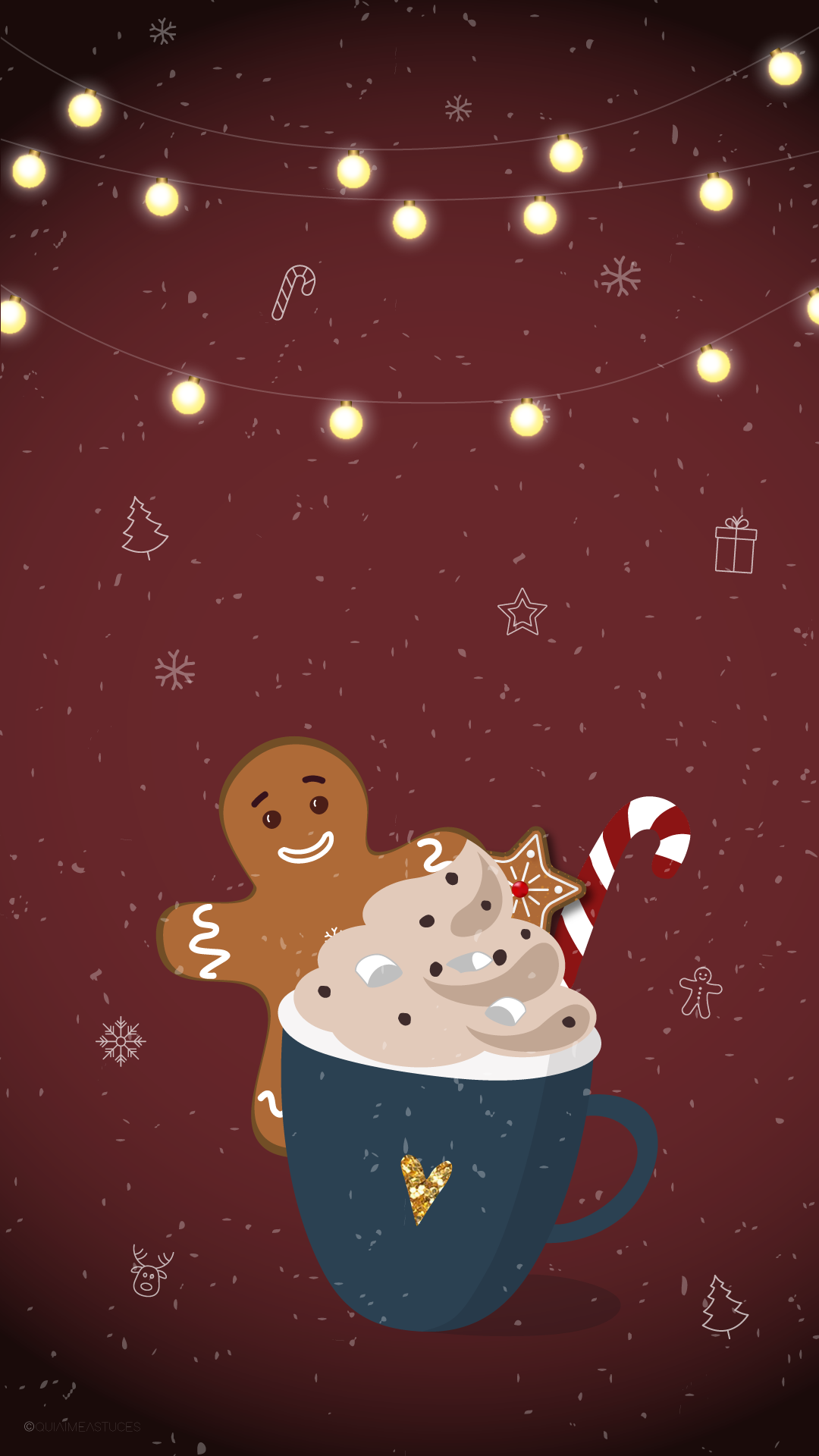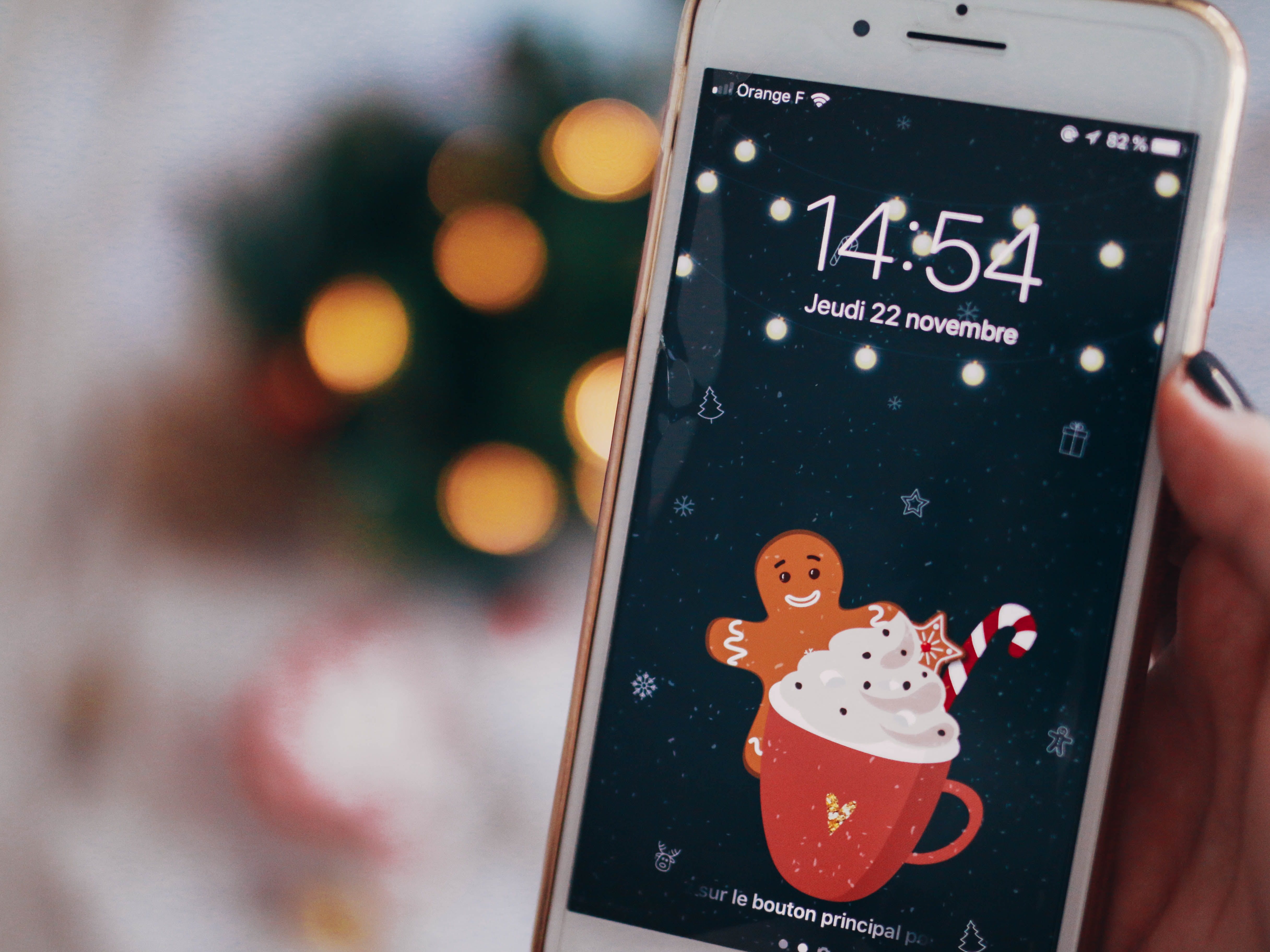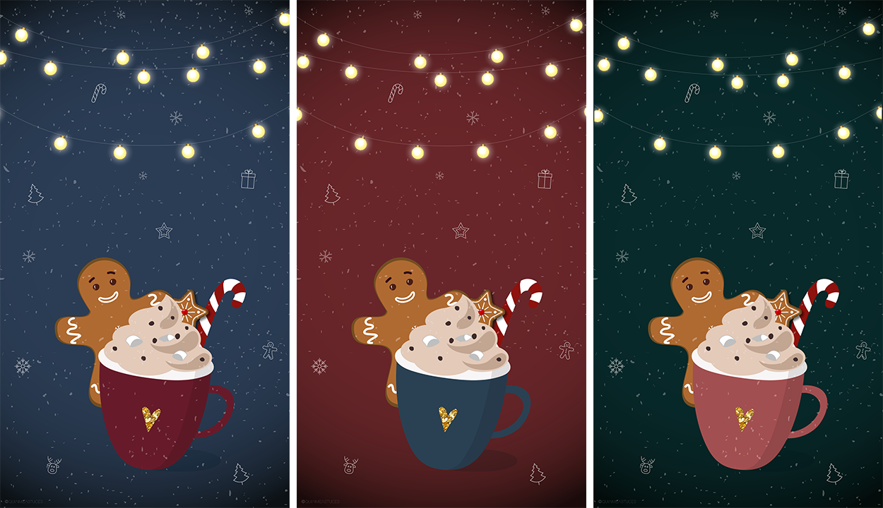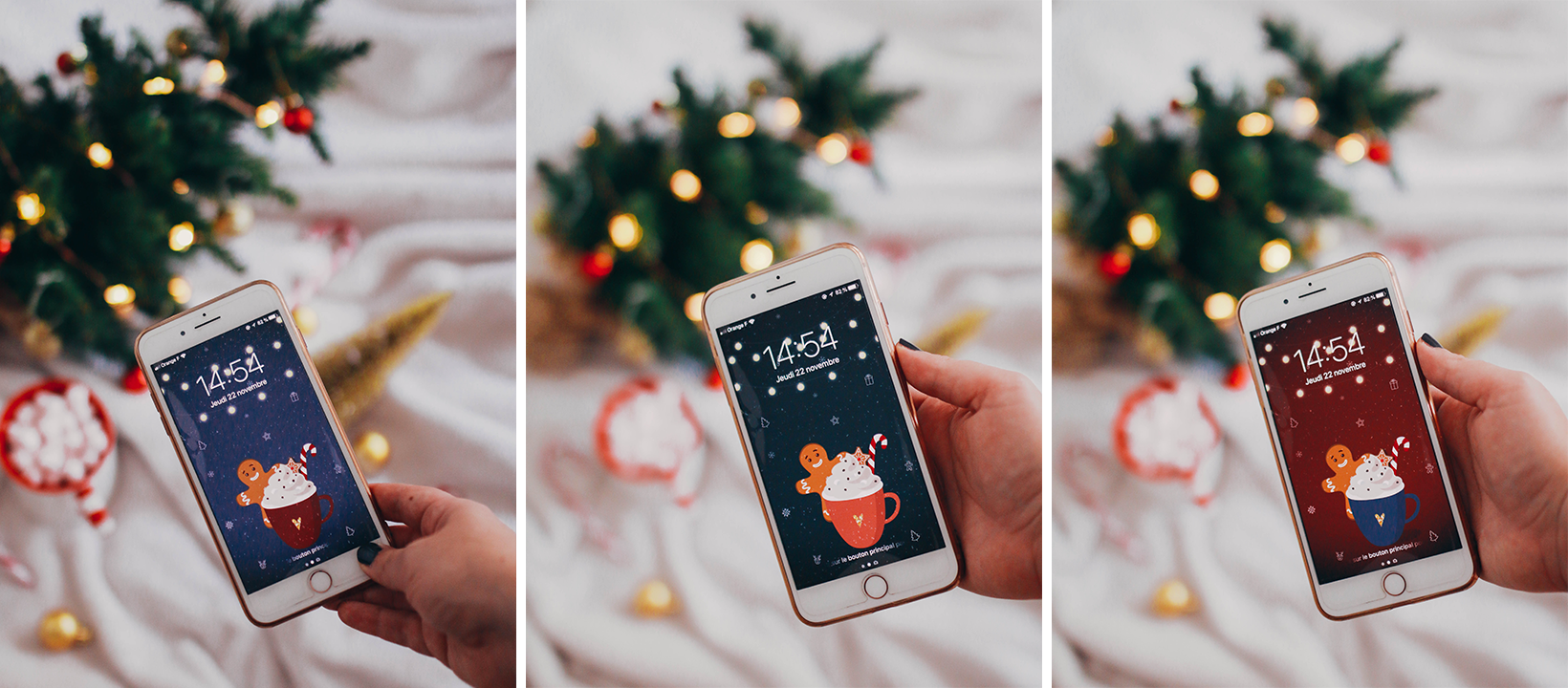 Hello hello! J’espère que vous allez bien ? C’est le coeur léger, écoutant la playlist de Noël d’Angéline (Carnet Prune) et sirotant un chocolat chaud (ultra cliché je sais ahah…) que je vous écris cet article aujourd’hui. Autant vous dire que je suis dans mon élément à 100%. C’est définitivement ma période préférée de l’année… Le froid, les odeurs gourmandes, les lumières, la préparation du sapin, l’ambiance bref je suis FAN de Noël. C’est donc logique que mes fonds d’écran préférés à préparer soient ceux de cette période… 🙂 J’ai allumé ma bougie senteur sapin ça me donne le sourire si vous saviez ahah. Je me suis une fois de plus éclatée à créer celui-ci. L’éternel petit biscuit en pain d’épice (comme chaque année, je l’adore), le chocolat chaud et les marshmallows, de la neige, des jolies guirlandes lumineuses pour rehausser le tout et le voici ! Je suis fan ! J’espère de tout coeur que vous l’aimerez aussi et qu’il vous donnera le smile dès que vous prendrez votre téléphone en main ♥ Comme bien souvent je l’ai prévu en 3 coloris car il en faut pour tous les goûts. Un rouge bordeaux profond, un joli bleu-vert canard, et un bleu plus foncé. Vous aimez ?