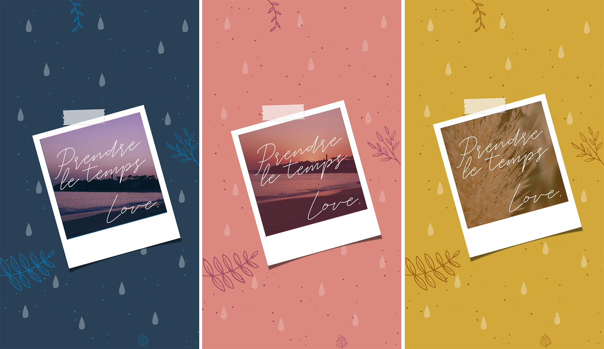Pour cette nouvelle édition, j’ai tout de suite imaginé quelque chose d’assez simple, mais qui me parle beaucoup, à savoir deux notions : les photos de vacances & la sérénité. Vous ne le savez peut-être pas, mais je suis une très grande stressée. La rentrée c’est chouette, mais dans ma tête c’est surtout synonyme de chamboulement, de nouveaux projets à gérer, le boulot à côté etc. Que des trucs assez cool en soi (avec les aléas de la vie en plus), mais je suis comme ça, je pense à tout en même temps, je gère 100 trucs à la fois et j’ai besoin de me canaliser. Ça va nettement mieux avec les années qui passent. Je grandis et je comprends mieux mon esprit, mon corps et mes limites. Je sais comment faire pour parvenir à gérer mes angoisses sans que cela perturbe mon organisation et c’est une belle victoire. Il était donc assez évident d’évoquer une notion de calme dans cette nouvelle création. « Prendre le temps » de s’écouter, « prendre le temps » de se comprendre pour mieux avancer… Pour finir, j’ai lié ce mantra qui me tenait à coeur à des photos de vacances que j’adore et qui me font du bien lorsque je tombe dessus. J’espère que vous les aimerait aussi. Côté couleurs, je suis partie sur des tonalités qui m’évoquent l’automne, mais pas trop. Un passage en douceur de l’été à l’automne en quelque sorte.