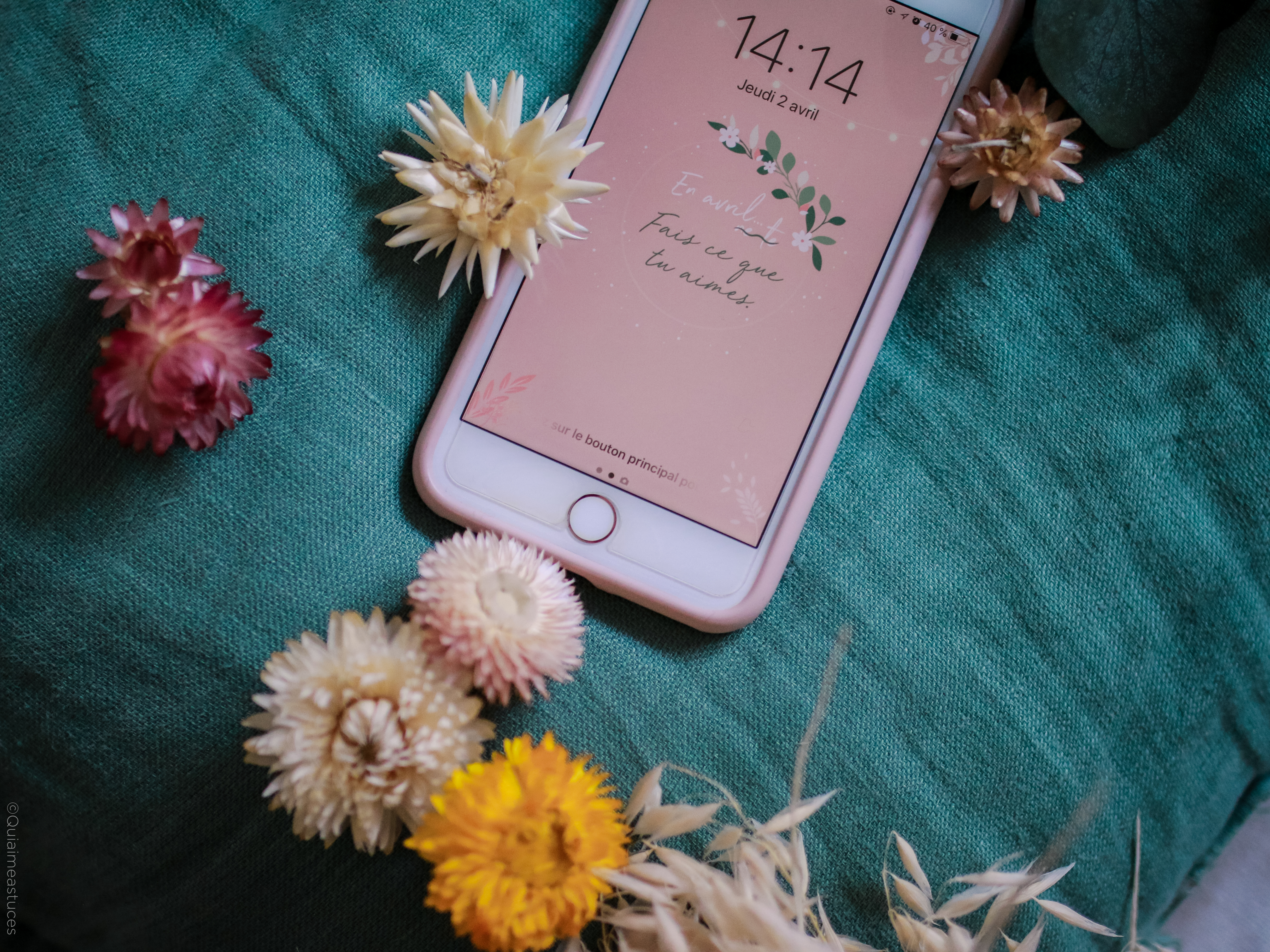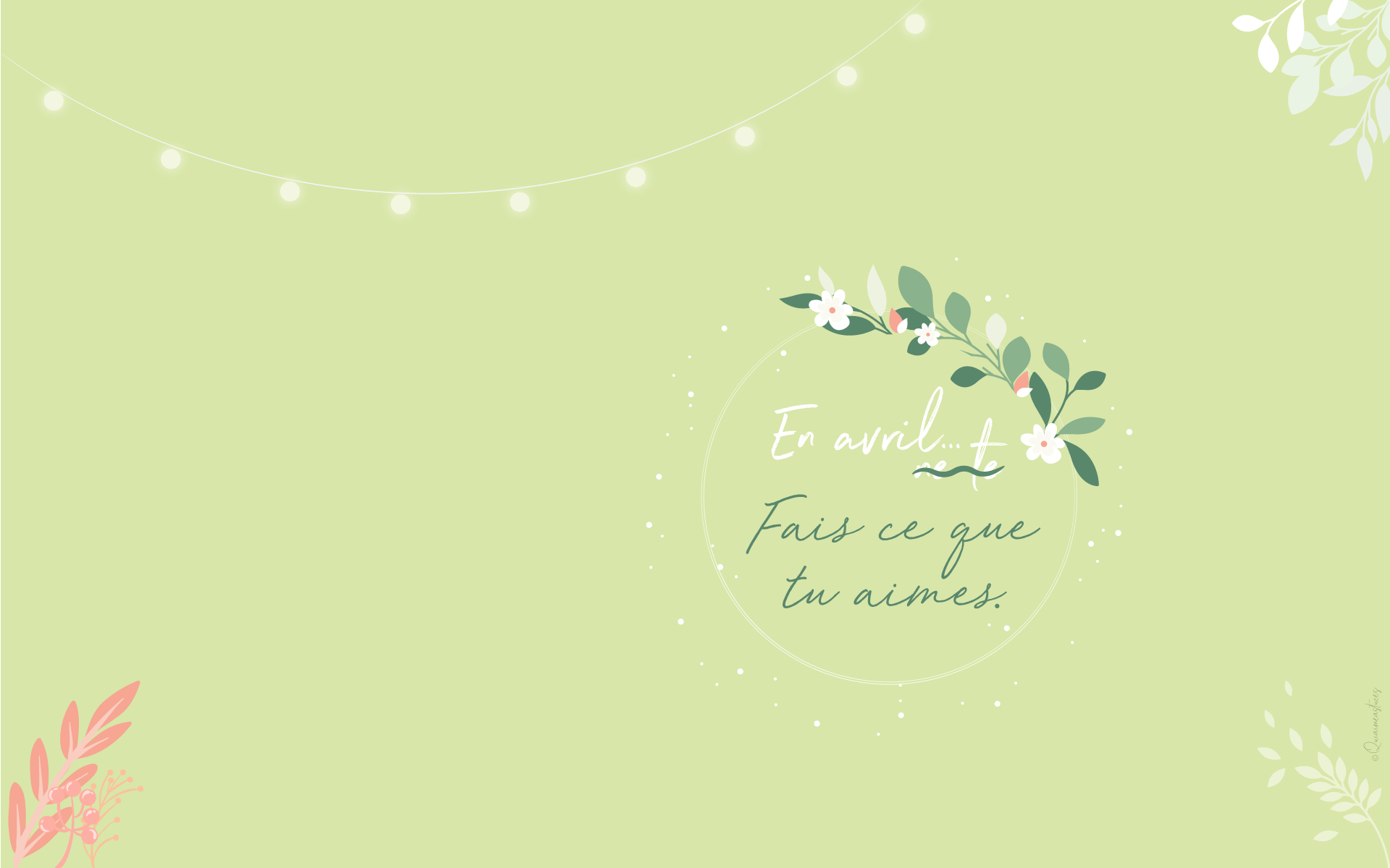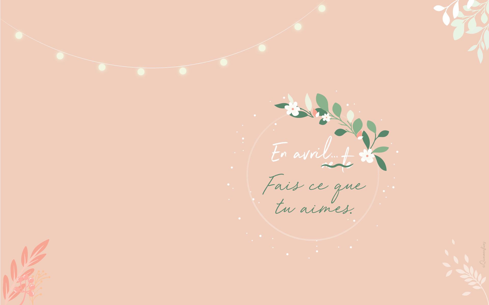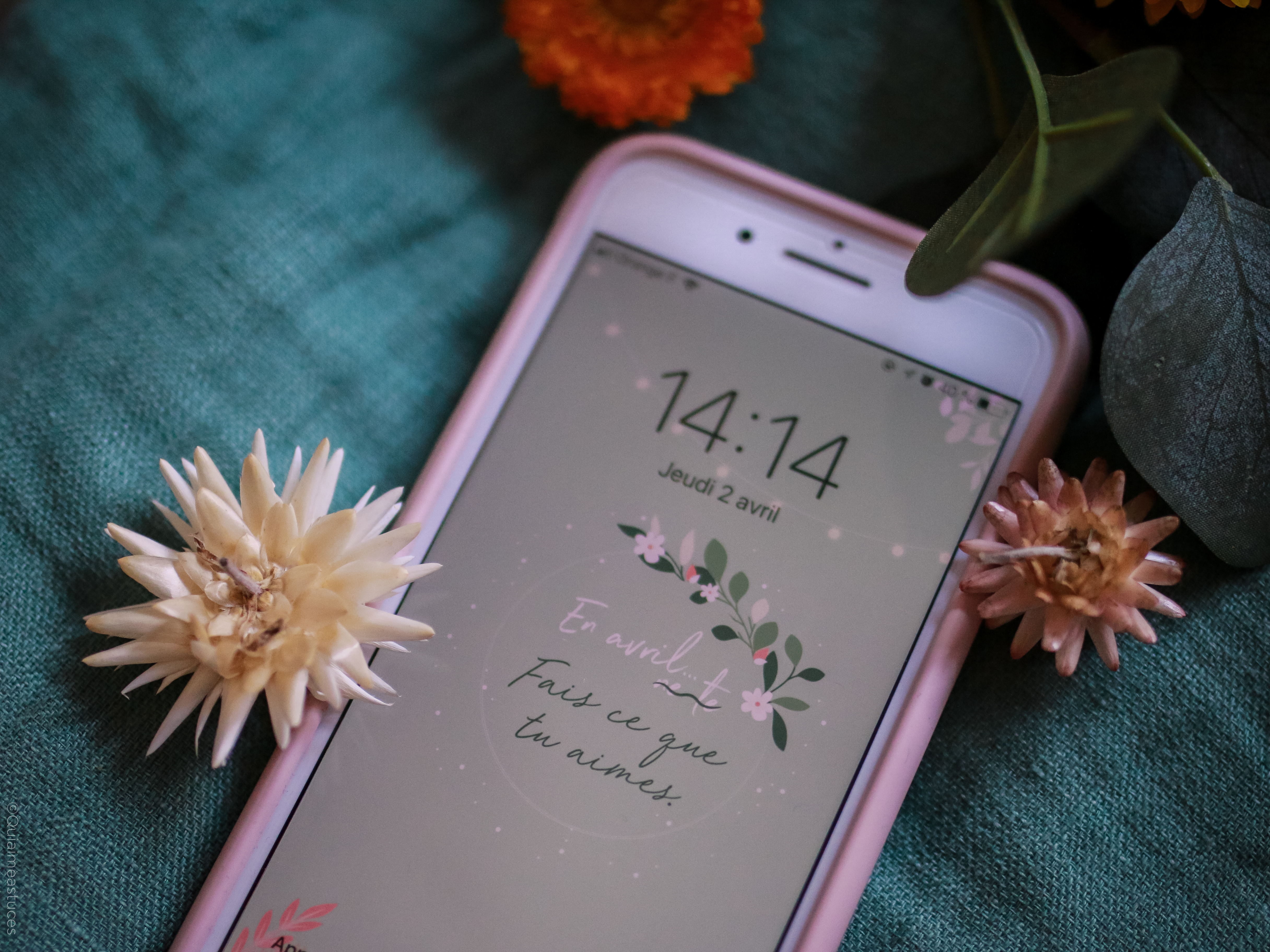 Hello, hello ! Pour commencer, j’espère que vous allez bien malgré la situation particulière que nous vivons actuellement… À l’heure où j’écris ces quelques mots, nous sommes tous & toutes confiné.es chez nous début avril 2020. Un sentiment particulier, mais cet espoir constant que tout s’améliorera bientôt. Je ne peux que croiser les doigts et évidemment rester chez moi pour que mon souhait devienne réalité… prochainement. Comme tous les mois, me revoici par ici, sur le blog, pour le fond d’écran du mois. Qu’est-ce que j’adore ça ! Je vous jure, à chaque fois c’est une vraie partie de plaisir ! D’ailleurs j’ai publié les backstages de la création de cette mise en scène dans mes stories Instagram. En premier lieu je dois dire que le printemps m’inspire. En effet, cette saison me redonne le sourire. Le printemps, même chez soi, ça fait du bien. Comme un vent de fraicheur. Des fleurs et des couleurs douces, tout ce que j’aime finalement… En avril, fais ce que tu aimes ! Ce petit « slogan » adapté du proverbe d’origine, m’a semblé évident. En ce moment, plus que jamais, nous avons besoin de faire ce qui nous fait du bien.