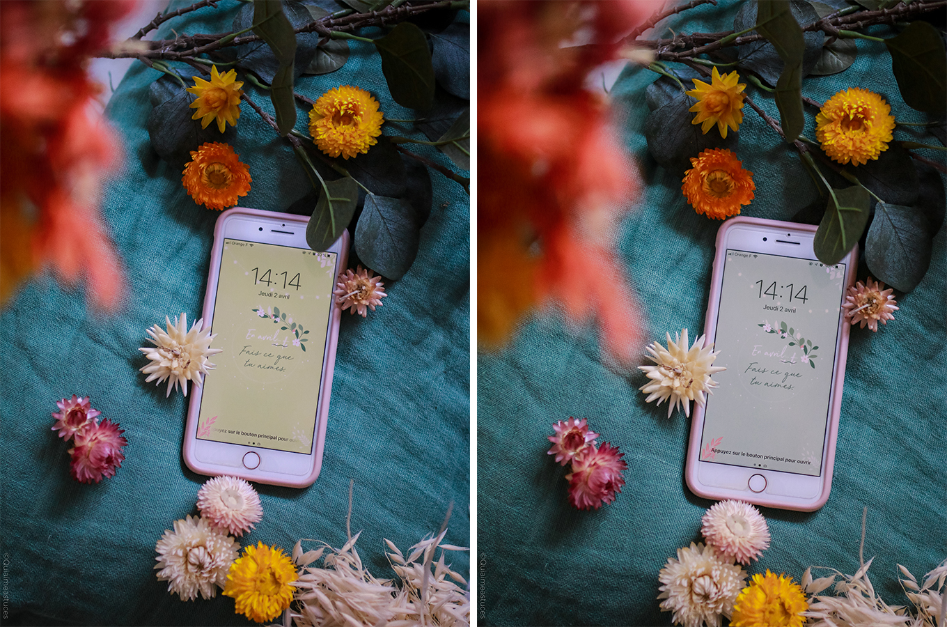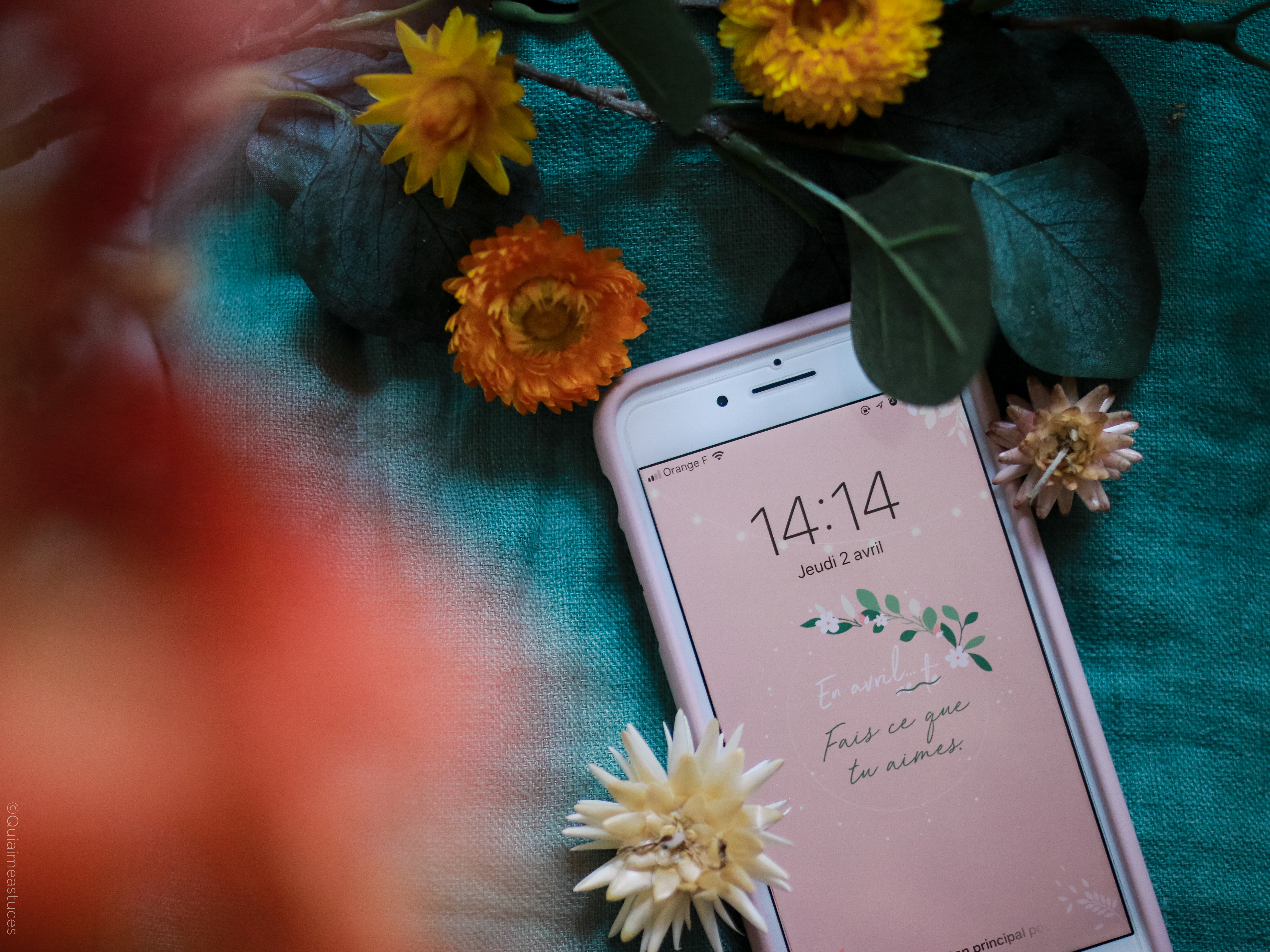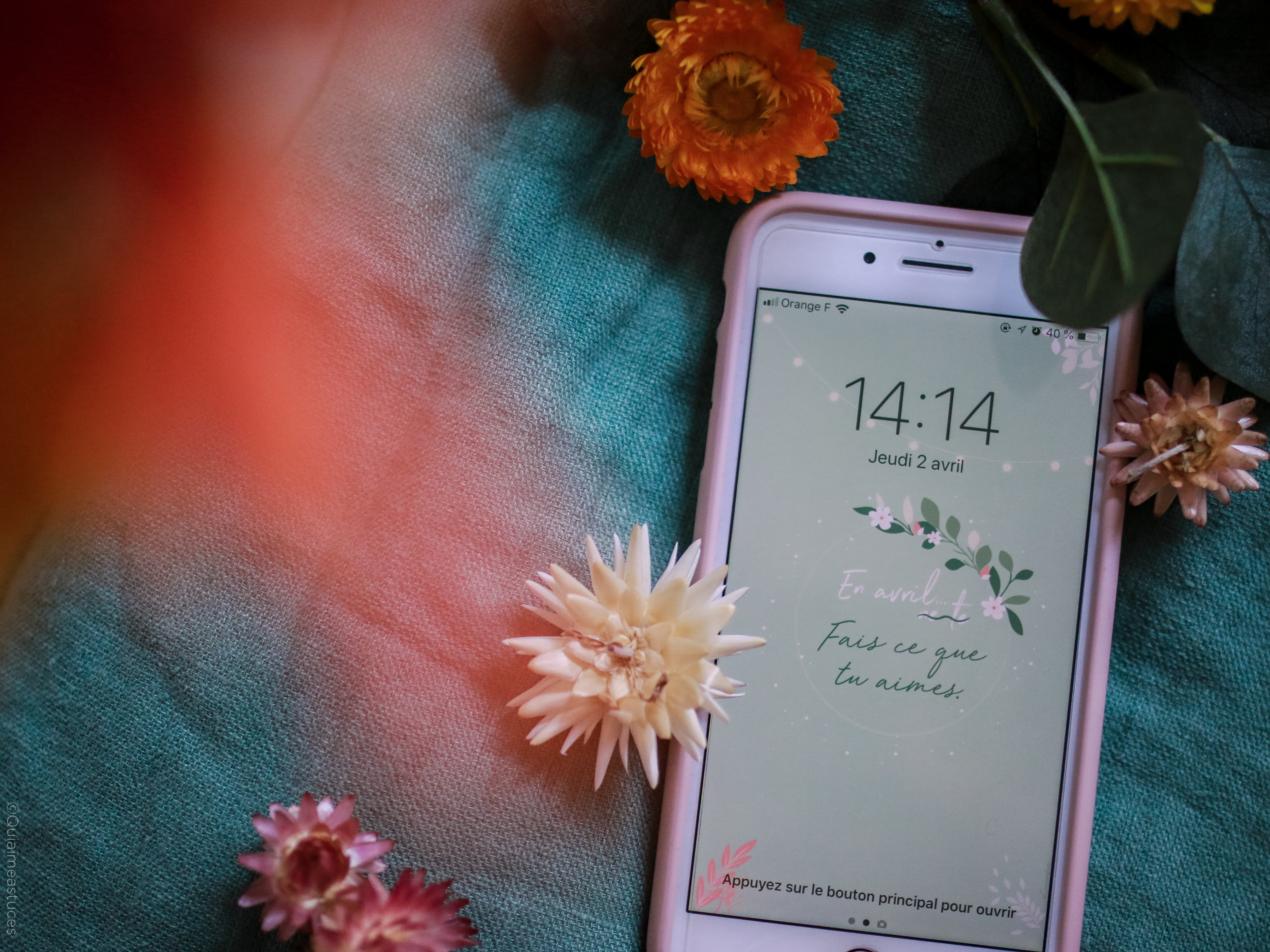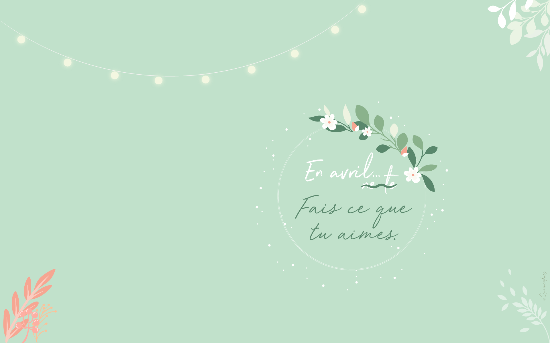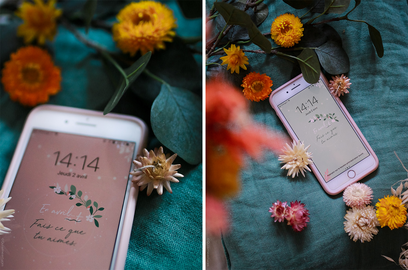 Hello, hello ! Pour commencer, j’espère que vous allez bien malgré la situation particulière que nous vivons actuellement… À l’heure où j’écris ces quelques mots, nous sommes tous & toutes confiné.es chez nous début avril 2020. Un sentiment particulier, mais cet espoir constant que tout s’améliorera bientôt. Je ne peux que croiser les doigts et évidemment rester chez moi pour que mon souhait devienne réalité… prochainement. Comme tous les mois, me revoici par ici, sur le blog, pour le fond d’écran du mois. Qu’est-ce que j’adore ça ! Je vous jure, à chaque fois c’est une vraie partie de plaisir ! D’ailleurs j’ai publié les backstages de la création de cette mise en scène dans mes stories Instagram. En premier lieu je dois dire que le printemps m’inspire. En effet, cette saison me redonne le sourire. Le printemps, même chez soi, ça fait du bien. Comme un vent de fraicheur. Des fleurs et des couleurs douces, tout ce que j’aime finalement… En avril, fais ce que tu aimes ! Ce petit « slogan » adapté du proverbe d’origine, m’a semblé évident. En ce moment, plus que jamais, nous avons besoin de faire ce qui nous fait du bien.