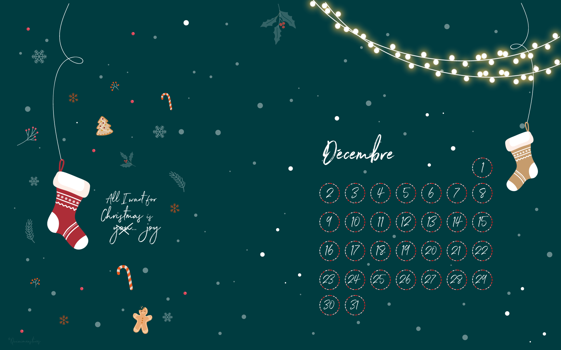 À la manière de mon sapin j’ai voulu ce fond d’écran assez traditionnel, avec des éléments simples, mais qui réchauffent le coeur et font penser à Noël. Ainsi vous allez y retrouver, des flocons, des petits biscuits de Noël, des sucres-d’orge, des sapins, du houx, des guirlandes lumineuses et bien sûr une chaussette de Noël pleine de chocolats (si, si je vous l’assure).