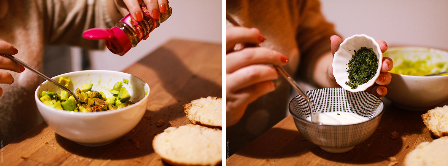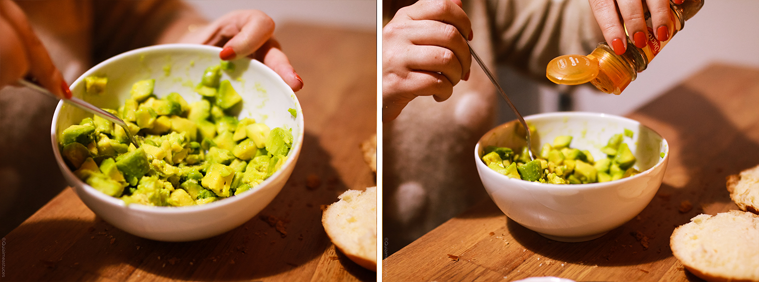 À l’aide d’une fourchette, écraser l’avocat, ajouter le cumin et les épices, saler & poivrer.