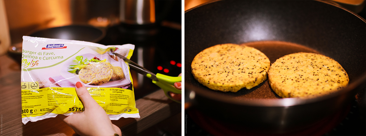 4) Faire cuire les galettes burgers fèves & quinoa dans une poêle préalablement chauffée 3 minutes de chaque côté.