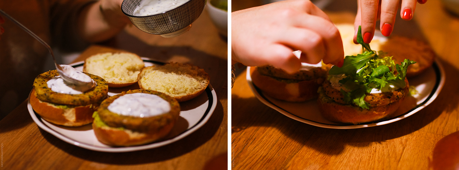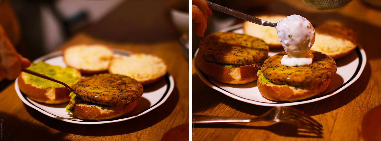 6) Dresser les burgers en mettant sur la base du pain, le guacamole, la galette de quinoa, la sauce à base de yaourt soja, quelques feuilles de mesclun et refermer le burger.