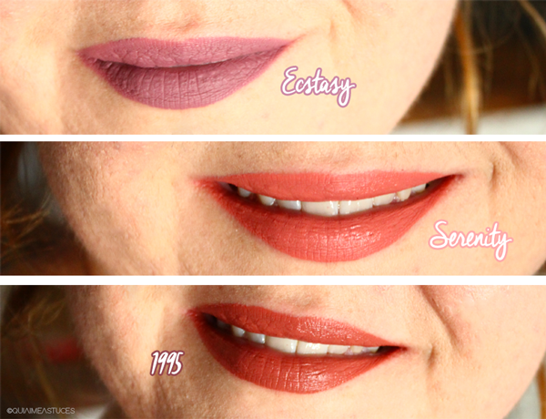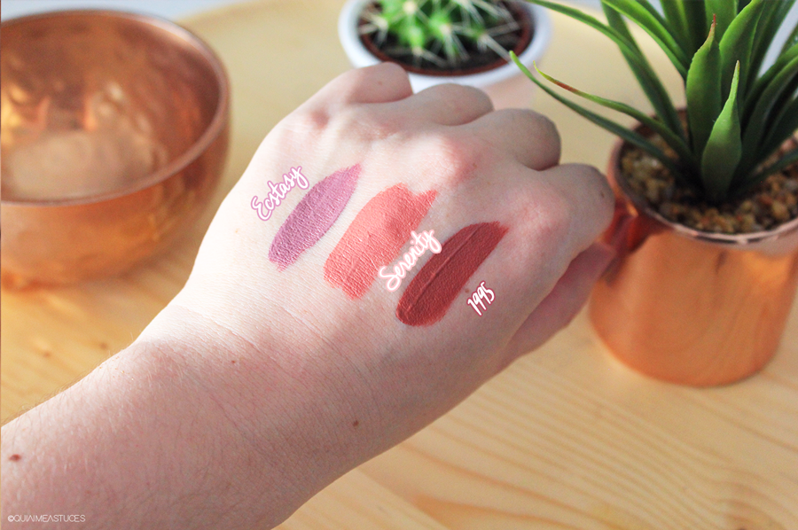 J’ai choisi 3 couleurs et j’avais vraiment hâte de les tester. Souvent, avec les rouges à lèvres liquides, la couleur fonce un peu en séchant. C’est légèrement le cas avec ceux-ci. Ecstasy que j’avais déjà vu notamment sur ma copine Sarah (@Sawahbens). C’est d’ailleurs grâce à elle que j’ai découvert ces produits et je ne peux que la remercier ahah. Pour en revenir à la teinte, je la trouve superbe ! Un peu dark, juste ce qu’il faut, mais il peut vraiment faire très chic et original à la fois. J’ajoute parfois une petite note rose au centre pour l’adoucir un petit peu. Serenity est mon coup de coeur car je le porte la journée, au quotidien. Il est parfait ! C’est un très joli rose/corail chaud presque nude sur ma carnation. Il va avec tous mes maquillages, le top ! Pour finir, 1995 est une teinte assez étonnante (pour moi ahah). Il s’agit d’un rose orangé foncé aux sous-tons marronnés. J’aime beaucoup le porter lorsque je ne mets rien d’autre que du mascara sur mes yeux. Pour éviter l’effet too much. C’est le genre de rouge à lèvres qui se suffit à lui-même 🙂 J’espère de tout coeur que cette revue vous aura plu et que la tentation ne sera pas trop grande, sinon vous avez le droit de m’engueuler, promis hihi.