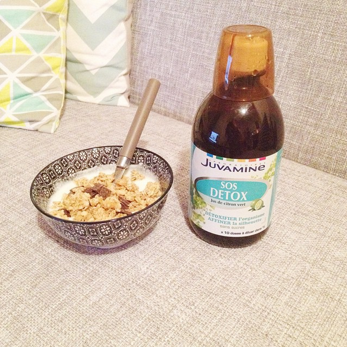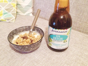 Depuis maintenant plus d’un mois, je bois chaque matin un grand gobelet d’eau tiède ou froide avec des rondelles de citron dedans. Ça purifie votre organisme et aide à l’élimination des toxines accumulées. OU je dilue dans 1,5L d’eau du jus de bouleau de chez Weleda. Boubou a pris l’habitude quant à lui de diluer un bouchon du SOS détox de chez Juvamine dans 50cl d’eau et il commence à ressentir quelques effets sur dans son organisme.