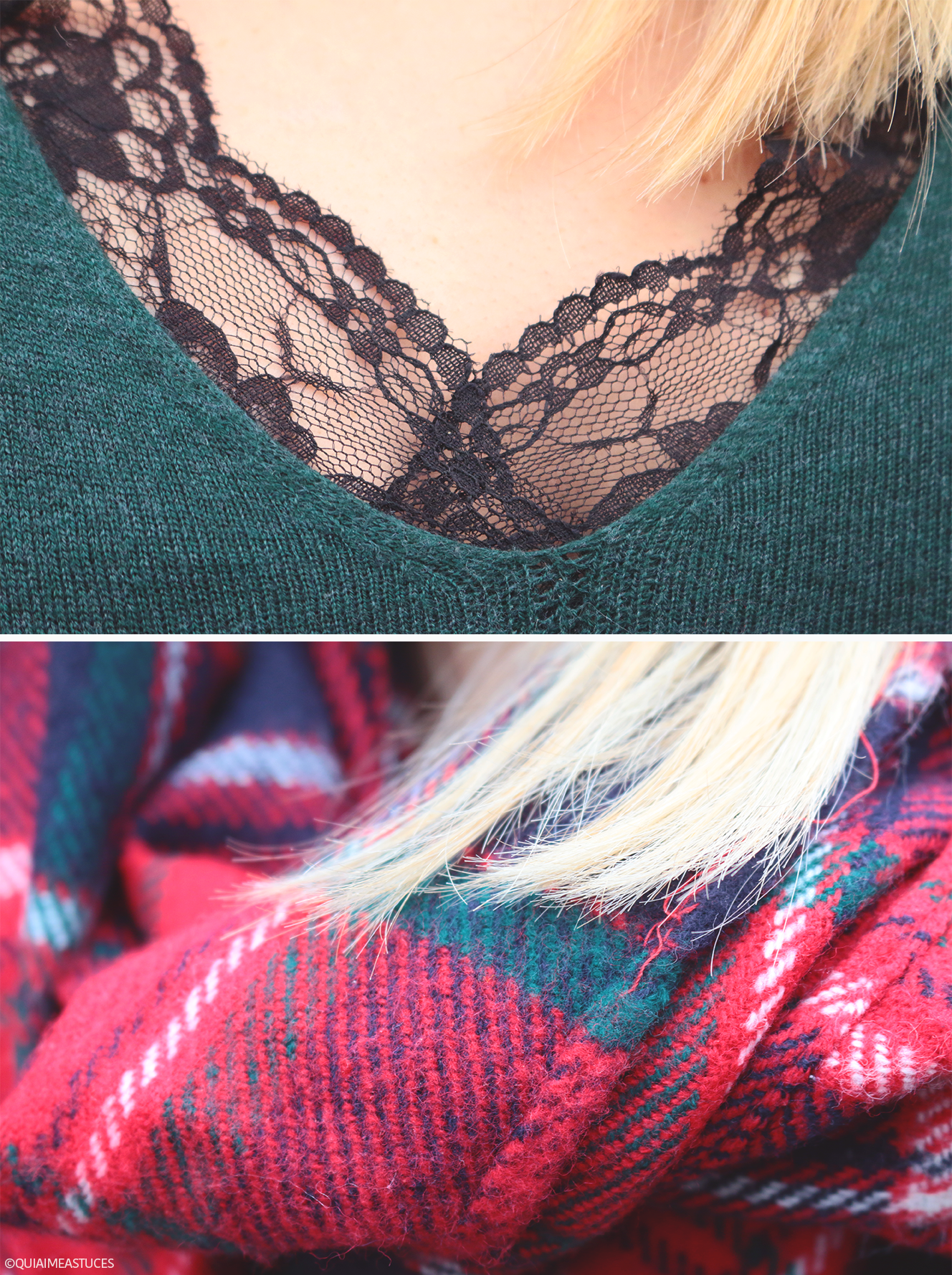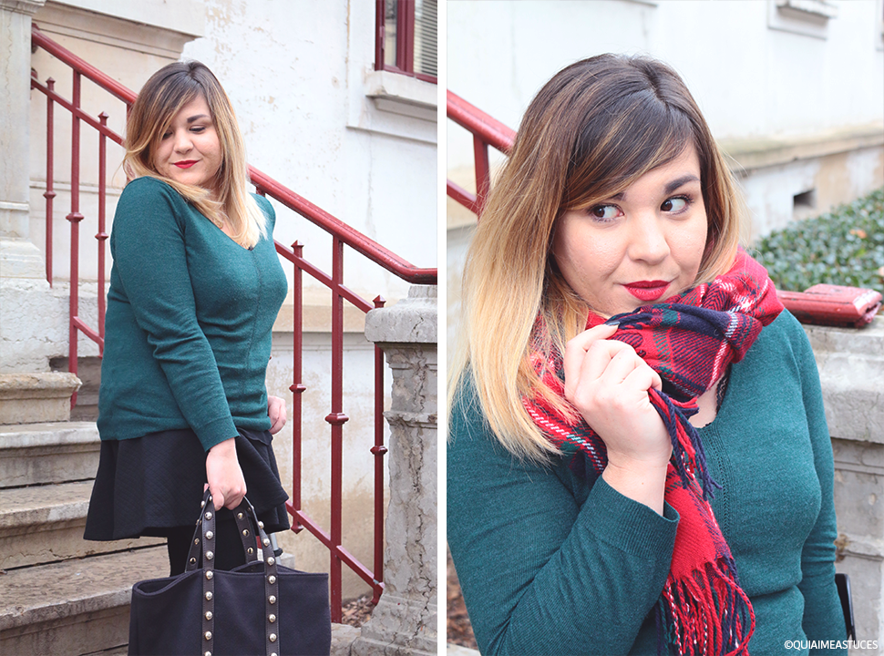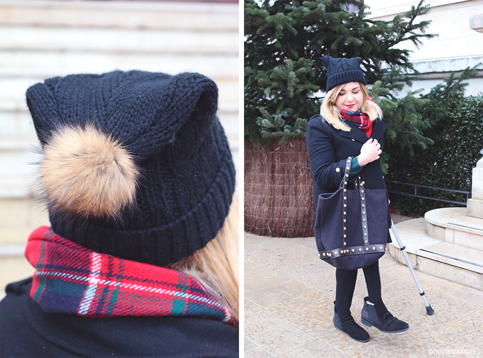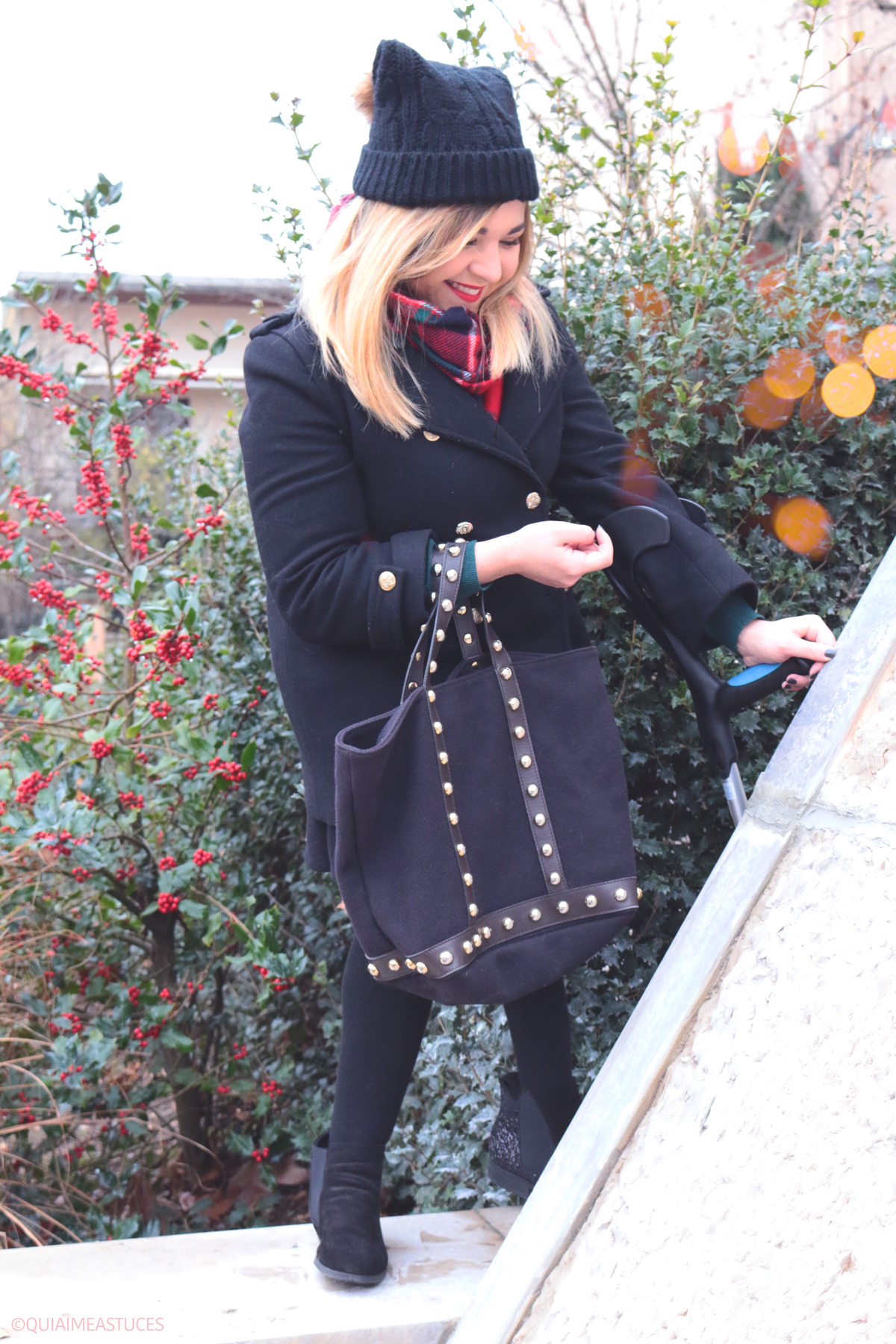 Coucou vous ! J’espère que vous allez bien ? Plus que 3 petits jours seulement avant Noël, l’impatience se fait sentir. Je m’y suis encore pris plus ou moins à la dernière minute alors je me retrouve à prier pour que le dernier cadeau que j’attends arrive avant vendredi. Croisons les doigts 🙂 Cette période m’inspire et me donne encore plus envie de faire des looks. Alors j’ai profité de la compagnie de ma copine Camille pour shooter celui que j’adore en ce moment. Parfait pour la saison, vous ne trouvez pas ? Du rouge, du vert, de l’écossais et un mignon petit pompon, l’esprit des fêtes est bien là ! J’ai notamment ressorti mon cabas Vanessa Bruno que j’adore. Ce sac est d’un pratique ! Et je fais parti, avec ma maman, des collectionneuses de sacs VB. À défaut de pouvoir me venger sur les chaussures, je suis définitivement une fille à sac à main… oups. Qui sait ? Peut-être que le Père Noël s’en souviendra cette année… J’espère que ce nouveau look vous plaira ! Et surtout je tenais à vous souhaitez un joyeux Noël, plein d’amour ! Profitez bien & attention aux chocolats ahah ♥