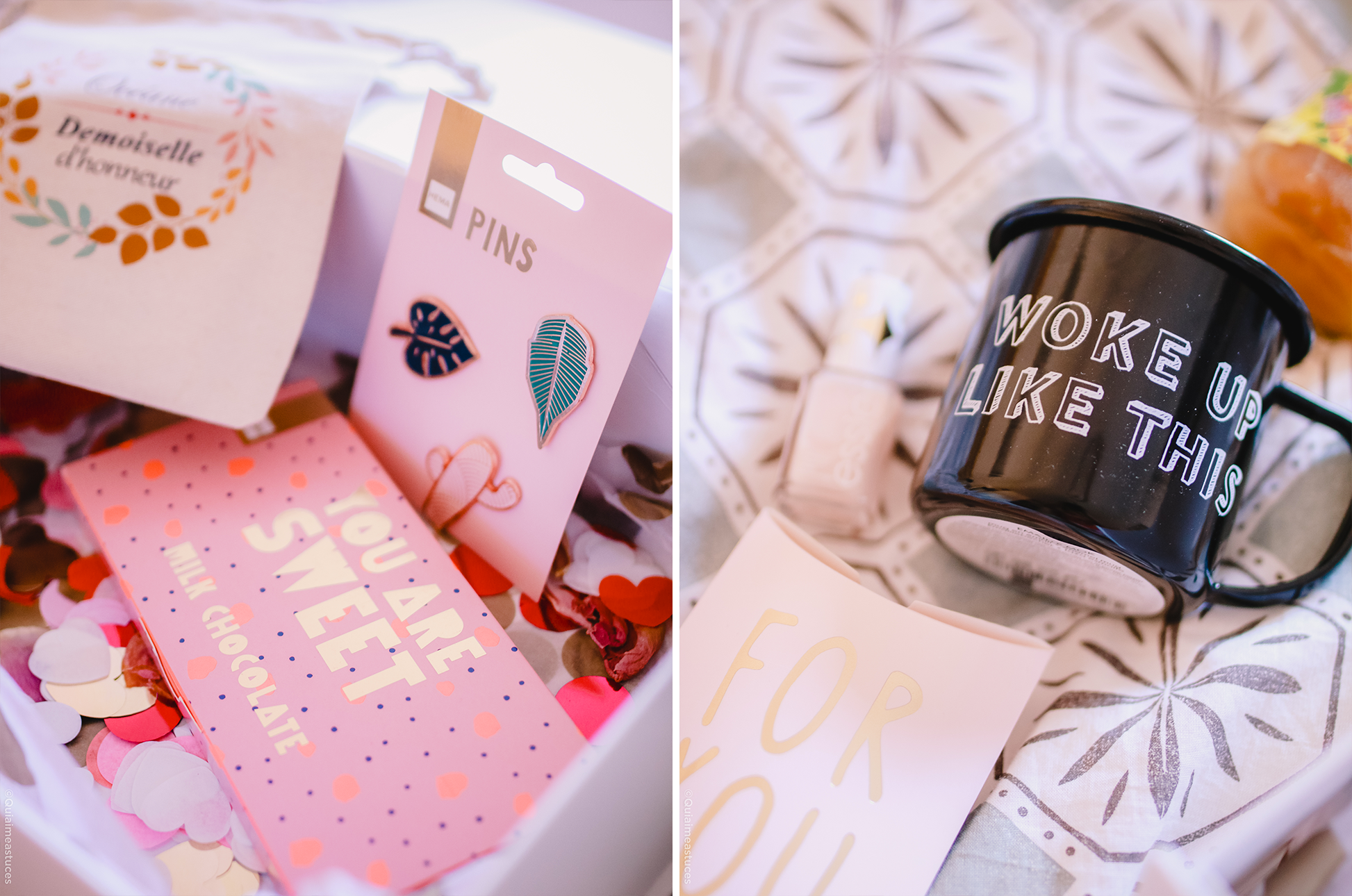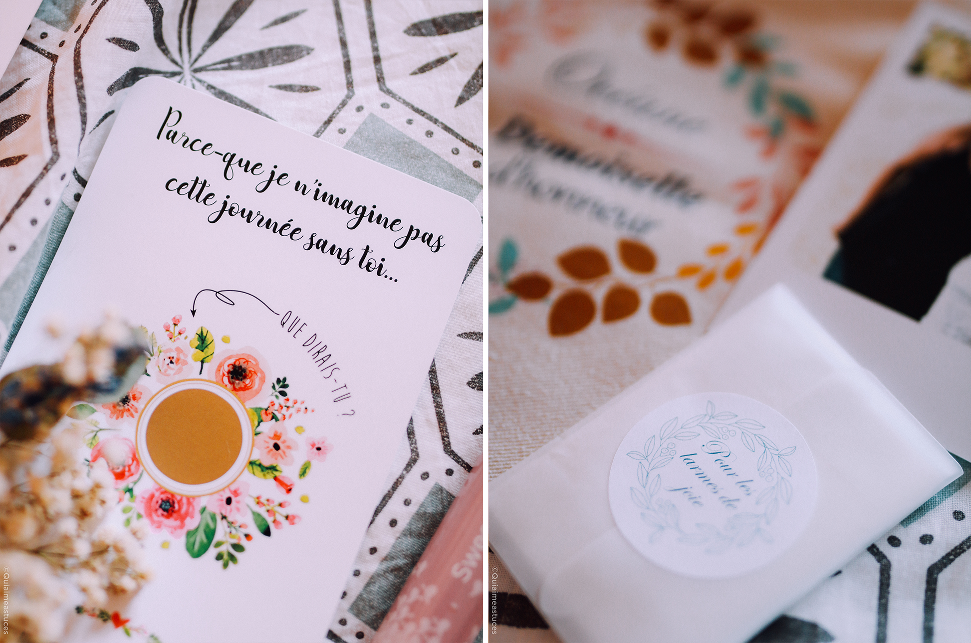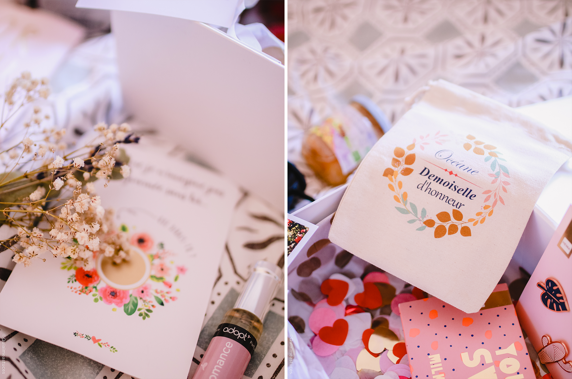 Le contenu des boites ? Chacun fait bien sûr selon ses envies & ses goûts (et selon ceux de vos ami(e)s). Pour ma part, je suis en tout premier lieu parti sur l’idée d’une carte à gratter. J’ai trouvé mon bonheur sur la boutique de « Petit Mouton Factory ». Je trouvais le concept beaucoup trop chouette. « Parce que je n’imagine pas cette journée sans toi… que dirais-tu (gratte) d’être ma demoiselle d’honneur? ». J’adore ! Le design, le petit mot, tout quoi ! – Dans la même logique de personnaliser le contenu des box, j’ai choisi des pochettes sur la boutique de MyHaruHaru sur Etsy. Le prénom des copines + demoiselle d’honneur, là encore avec un très joli design doux comme j’aime. À l’intérieur de celles-ci se trouve un paquet de mouchoir où il est écrit « pour les larmes de joie ». Les petits détails qui font toute la différence… Pour la suite, j’ai choisi un mix de plein d’articles qui font plaisir comme : du chocolat, du miel, un joli mug correspondant aux goûts de chacune, un vernis pour le jour J (mais pas que), un parfum de chez Adopt’ (je suis trop fan vous le savez), des petits pin’s, une sucette etc. Les box sont personnalisables à l’infini. Vous pouvez y ajouter du champagne, des bonbons, des bijoux, des bougies. On n’oublie pas les fleurs séchées pour la note champêtre que j’adore, des confettis pour le côté festif, un polaroïd avec nos bouilles et hop ! Tout ce qui pourra faire plaisir à vos ami(e)s. J’ai filmé l’ouverture des boites et ce sont des souvenirs que je garde précieusement en mémoire. Tellement touchée de partager la préparation de ce grand jour avec elles ♥