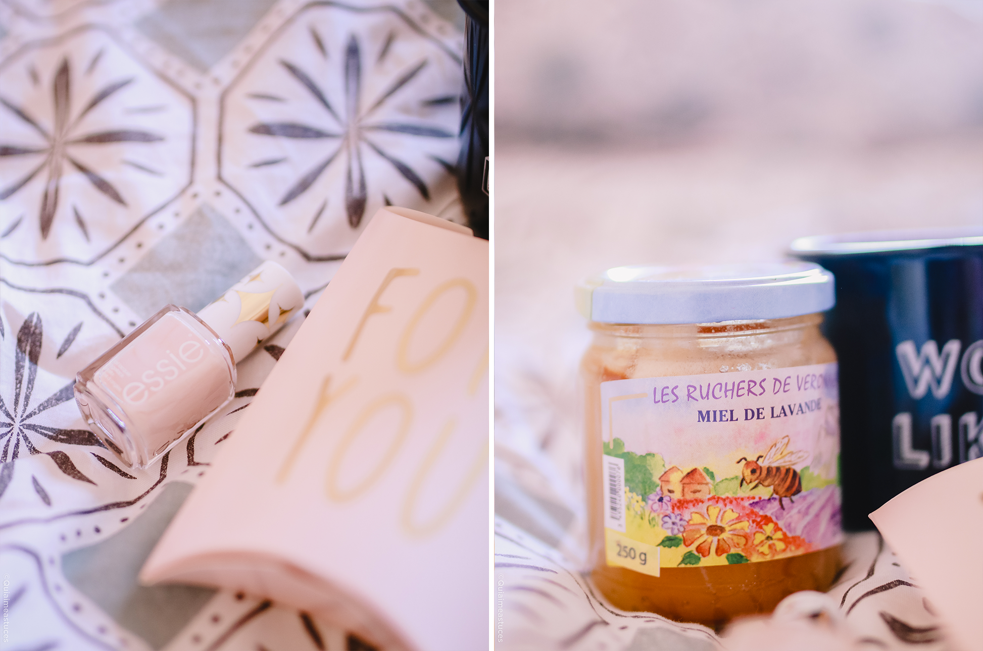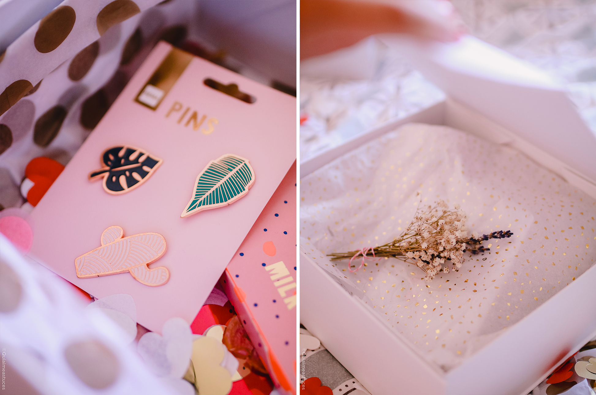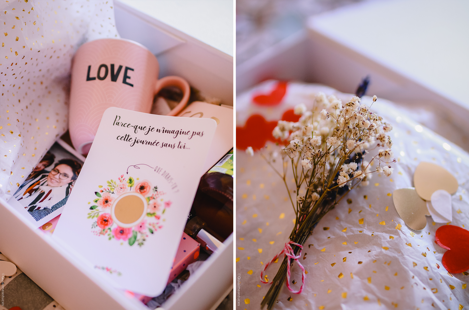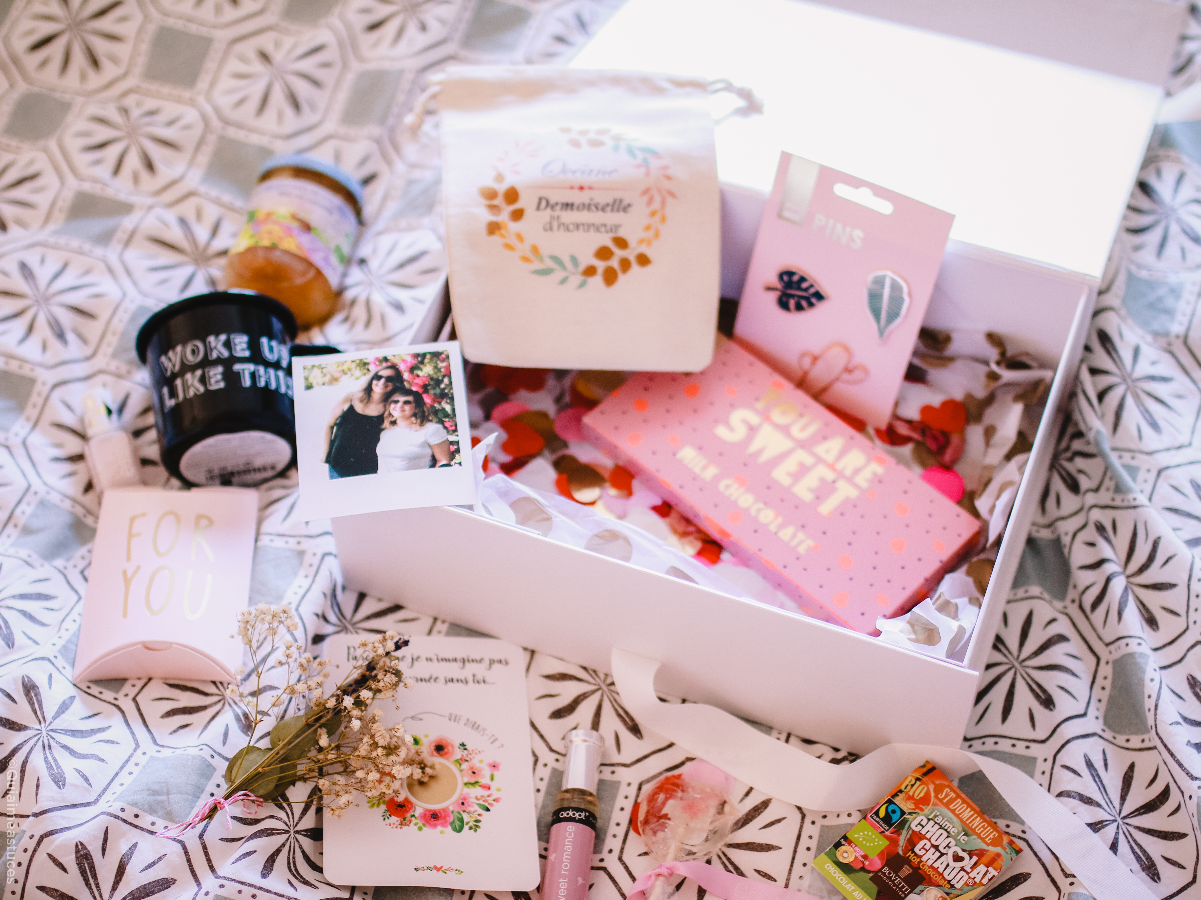 Le contenu des boites ? Chacun fait bien sûr selon ses envies & ses goûts (et selon ceux de vos ami(e)s). Pour ma part, je suis en tout premier lieu parti sur l’idée d’une carte à gratter. J’ai trouvé mon bonheur sur la boutique de « Petit Mouton Factory ». Je trouvais le concept beaucoup trop chouette. « Parce que je n’imagine pas cette journée sans toi… que dirais-tu (gratte) d’être ma demoiselle d’honneur? ». J’adore ! Le design, le petit mot, tout quoi ! – Dans la même logique de personnaliser le contenu des box, j’ai choisi des pochettes sur la boutique de MyHaruHaru sur Etsy. Le prénom des copines + demoiselle d’honneur, là encore avec un très joli design doux comme j’aime. À l’intérieur de celles-ci se trouve un paquet de mouchoir où il est écrit « pour les larmes de joie ». Les petits détails qui font toute la différence… Pour la suite, j’ai choisi un mix de plein d’articles qui font plaisir comme : du chocolat, du miel, un joli mug correspondant aux goûts de chacune, un vernis pour le jour J (mais pas que), un parfum de chez Adopt’ (je suis trop fan vous le savez), des petits pin’s, une sucette etc. Les box sont personnalisables à l’infini. Vous pouvez y ajouter du champagne, des bonbons, des bijoux, des bougies. On n’oublie pas les fleurs séchées pour la note champêtre que j’adore, des confettis pour le côté festif, un polaroïd avec nos bouilles et hop ! Tout ce qui pourra faire plaisir à vos ami(e)s. J’ai filmé l’ouverture des boites et ce sont des souvenirs que je garde précieusement en mémoire. Tellement touchée de partager la préparation de ce grand jour avec elles ♥