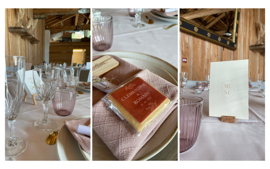 Des chandeliers, quelques bougies, les noms des tables sur des mini chevalets, des sablés, des couverts dorés, le nom des invités sur des morceaux de bois, et un petit parchemin avec à l’intérieur des petits jeux sur les mariés pour patienter entre les plats / apprendre à se connaître, discuter.