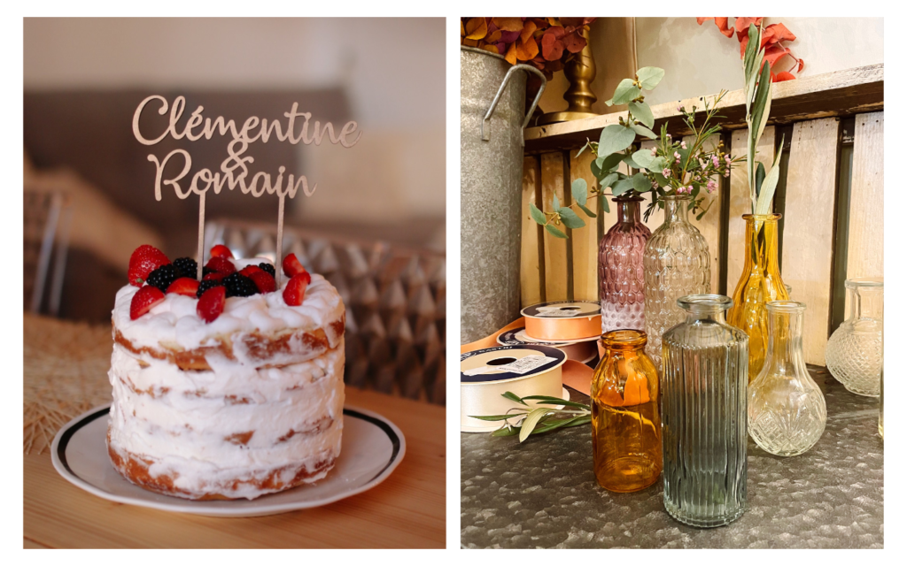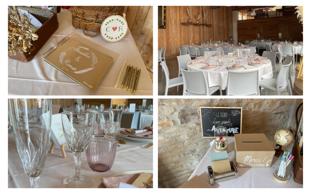 En ce qui concerne la vaisselle, l’arche (portes), le canapé en rotin il s’agit de location chez un prestataire + les vases de la fleuriste.