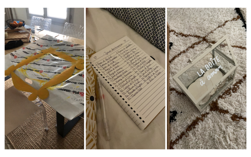 - Les écritures sur la boîte à amour, le plan de table, etc