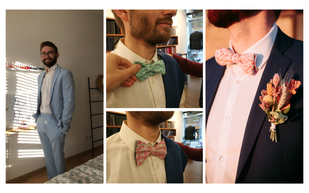 Les essayages se sont déroulés sur une journée avec mes témoins et c’était trop trop cool. J’avais pris rendez-vous chez Samson sur mesure. Il faut en moyenne compter 3 semaines pour la création du costume (comme c’est du sur mesure, choix des matières, couleurs, etc). Mes témoins avaient eux un nœud pap’ avec les mêmes motifs que le mien et ma témoin féminine avait quant à elle un bracelet avec le même motif.