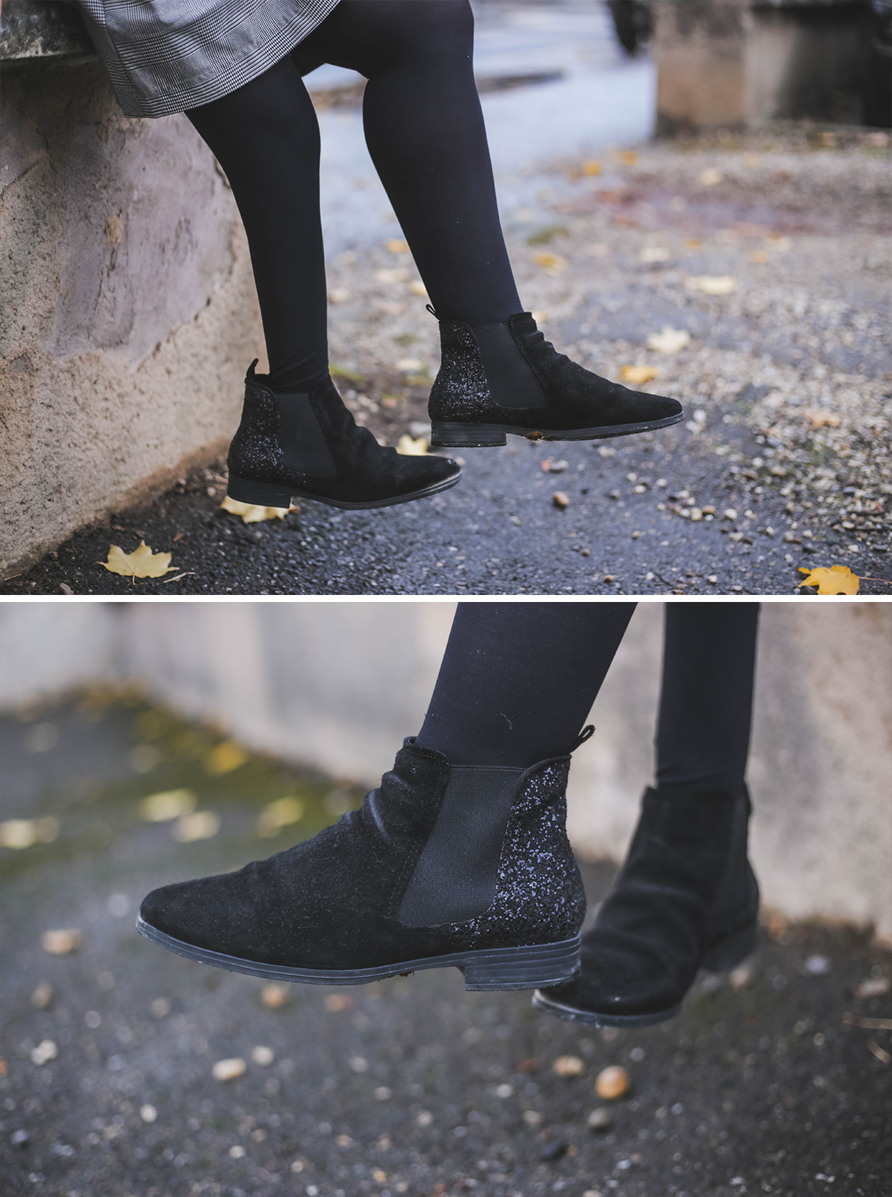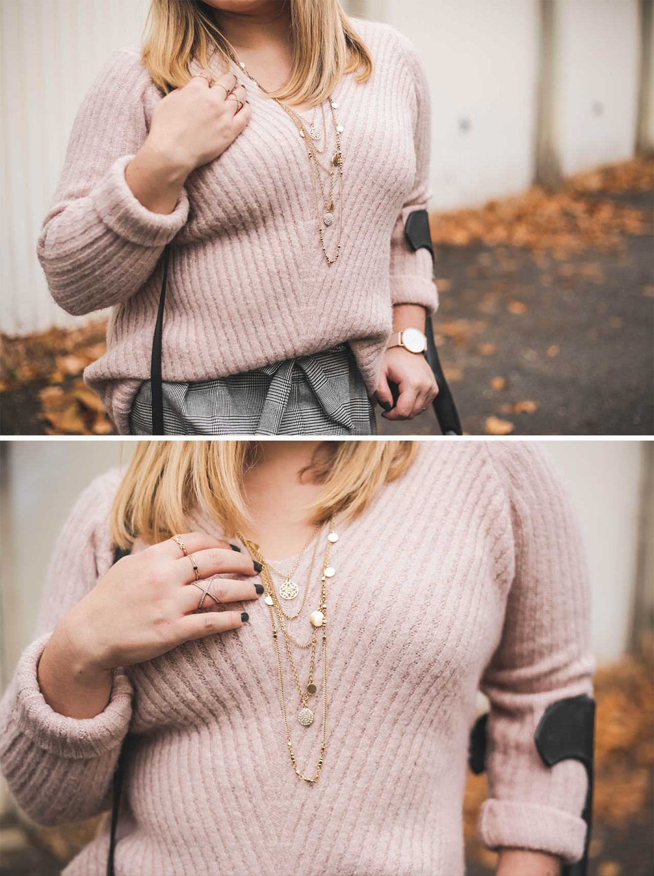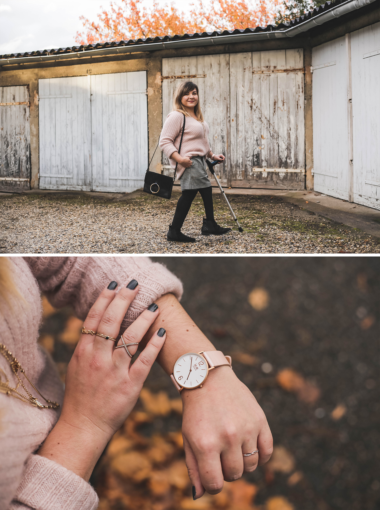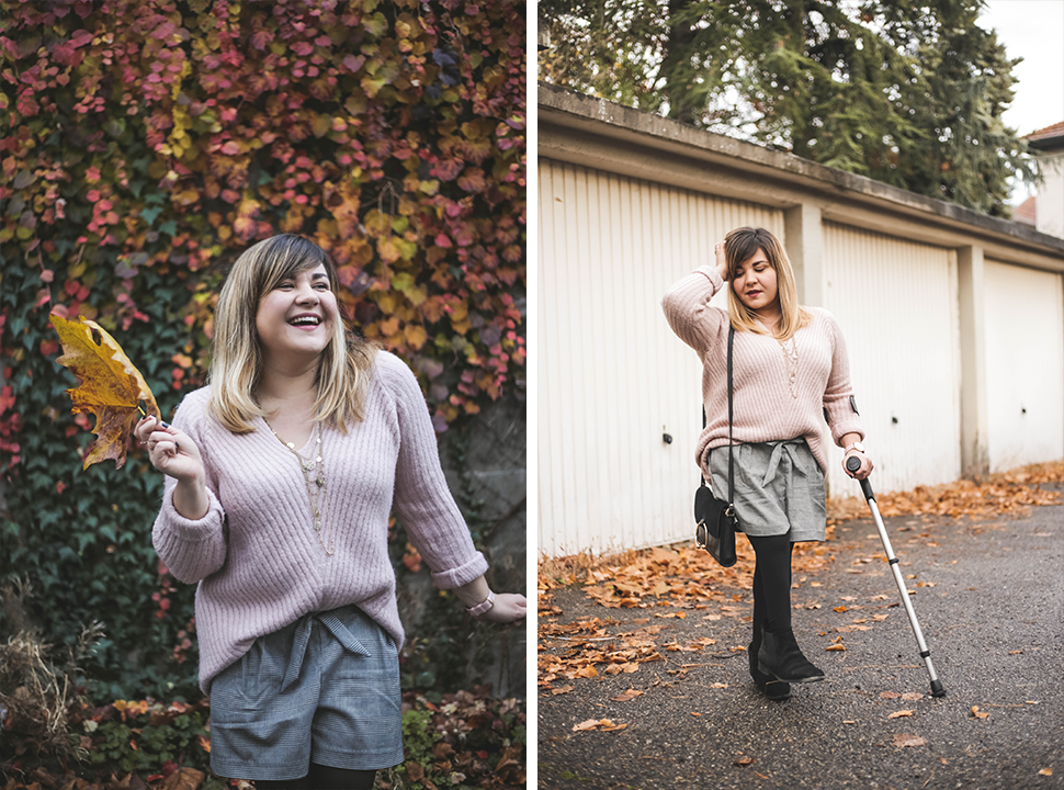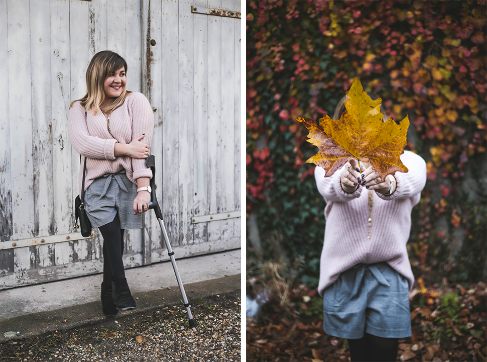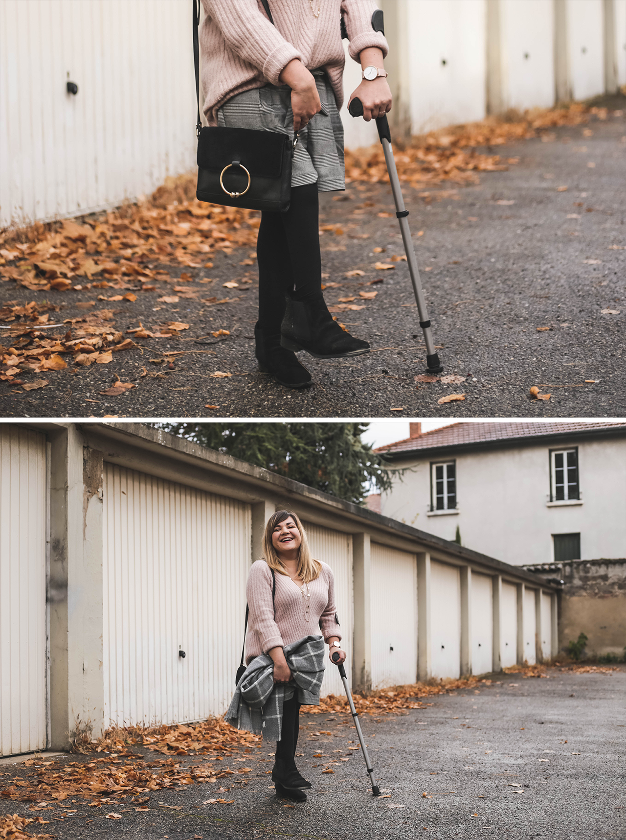 Ce pull Stradivarius est une petite merveille ! Tout doux, tout chaud, parfait pour la saison. Je l’ai pris un peu plus loose que ce que j’ai l’habitude de prendre pour y être encore plus à l’aise et j’adore. Combiné à mon short prince de Galles qui lui aussi vient de Stradivarius, mon écharpe grise à carreaux Pimkie et des Chelsea boots à paillettes La Halle. Le tour est joué ! Ce weekend, Tycia m’avait également prêté son sac et j’ai littéralement eu un coup de coeur pour ce dernier. Il s’agit du modèle Esther de chez Cherry Paris. C’est sûr que ça change de mon look – pyjama de Noël – haha, mais j’aime tout autant.