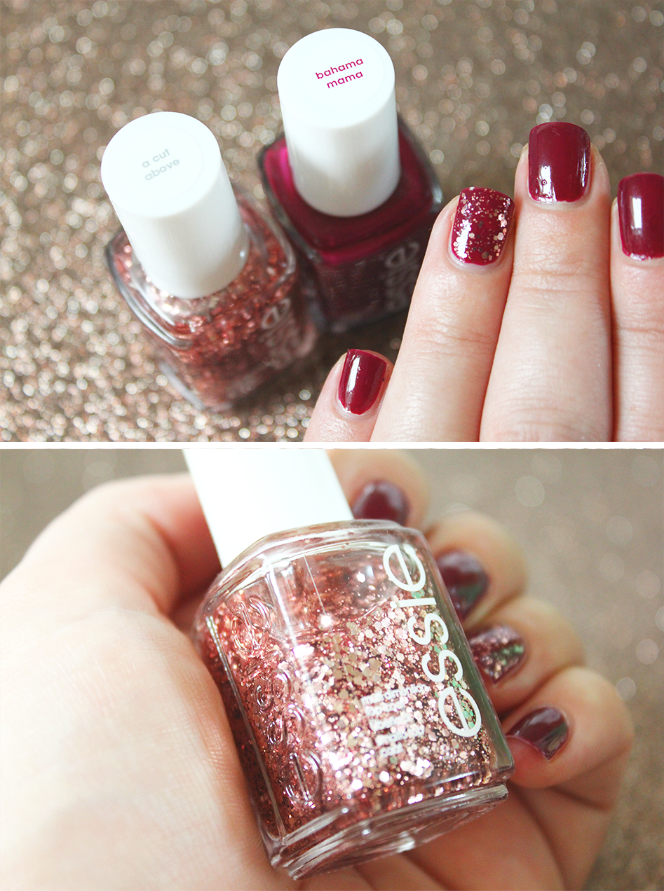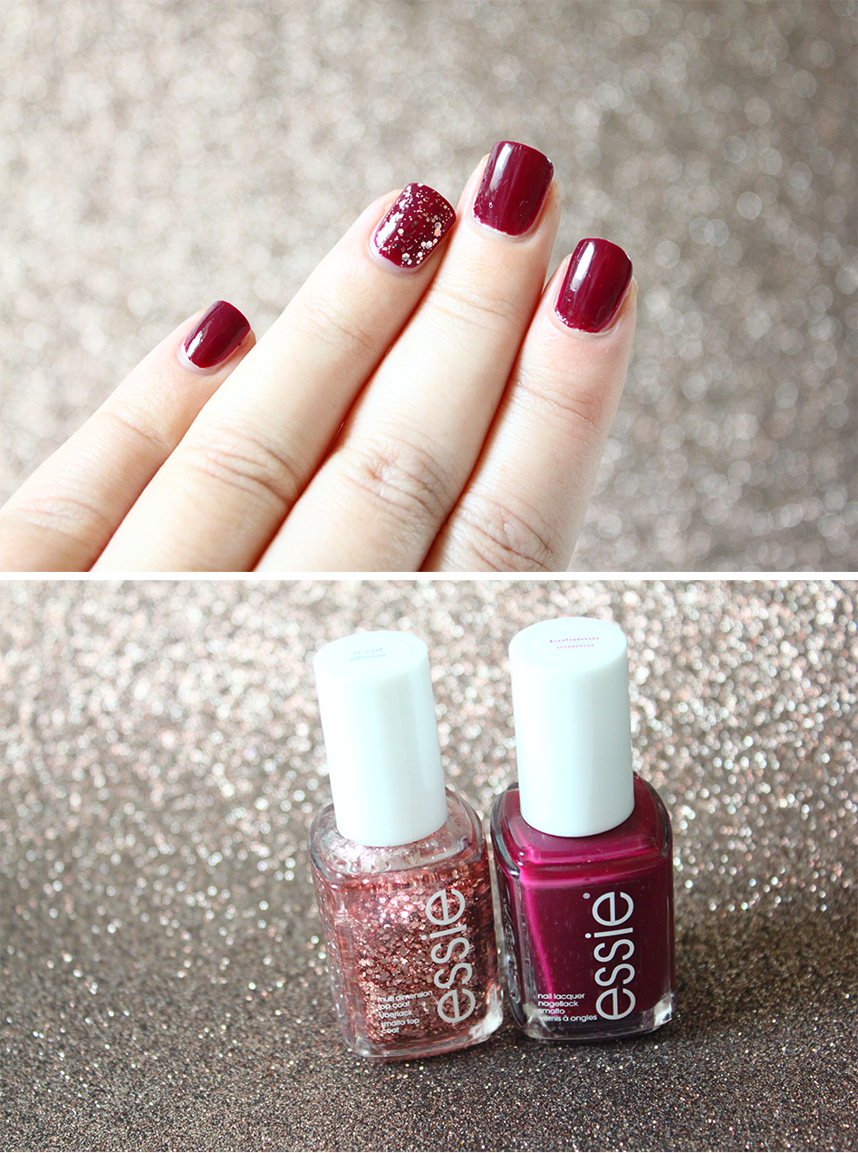 Sans aucun doute mon combo favoris du moment. Je le trouve parfait ! D’autant plus que j’ai toujours fait parti de celles qui adorent le bordeaux et lui trouve un petit côté très chic. Les paillettes rose gold ajoutent une petite note festive et originale que j’aime beaucoup.