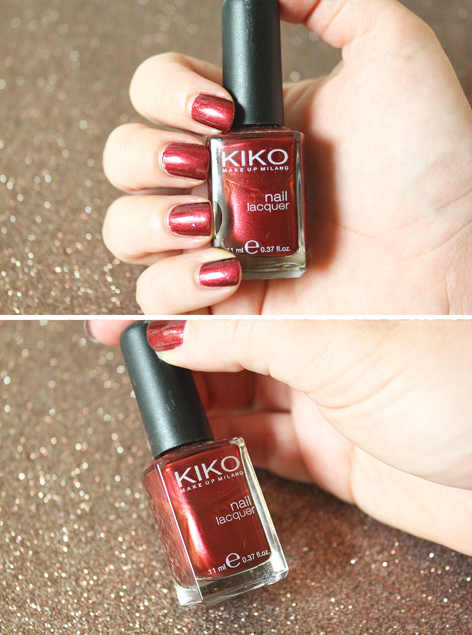 Dernièrement je me suis dit que ça faisait longtemps que je n’avais pas posé un de mes vernis Kiko. J’ai donc passé quelques minutes devant ma vernithèque avant de me décider pour celui-ci. Et là, énorme coup de coeur ! Vous savez c’est le genre de vernis que vous achetez parce que vous le trouvez magnifique, mais je ne sais pas pourquoi, je ne l’avais encore jamais mis haha ! Cette couleur me fait totalement penser à l’automne. Rouge aux paillettes plus foncés et dorés, bref il est sublime !