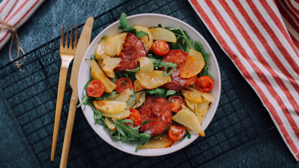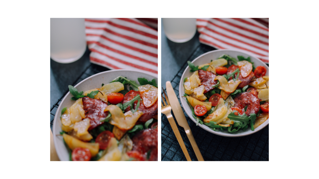 Hello, hello ! On se retrouve par ici pour une recette que nous adorons faire l’été avec Boubou : la salade pommes de terre chorizo. C’est simple, ça ne prend pas trop de temps et c’est surtout vraiment trop bon ! Pas toujours évident de varier les plaisirs. On tourne souvent en boucle avec les mêmes recettes. Un jour où nous cherchions l’inspiration dans le frigo, nous avons opté pour ce petit mélange et bien franchement nous ne regrettons pas du tout ! C’est parti pour la recette !