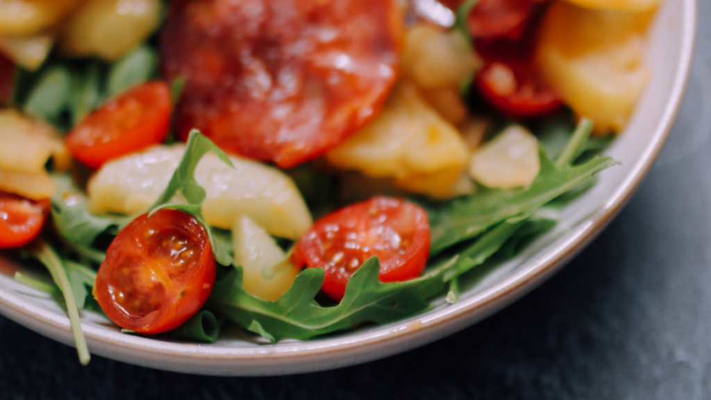 - Dans une assiette, ajoutez la roquette, les tomates cerises et le mélange pommes de terre & chorizo.