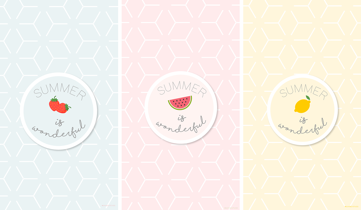 Le premier jour de l’été ? Ah oui. Bon, et si on faisait semblant ? Promis, j’ai usé de tous mes contacts pour faire venir le soleil, mais il boude un peu, beaucoup… Allez, on croise les doigts pour qu’il ramène sa fraise rapidement. Tiens, tiens, en parlant de fraise, aujourd’hui je reviens avec 3 nouveaux fonds d’écran pour vos téléphones en lien avec l’été, un peu de fraicheur et de gourmandise. J’espère de tout coeur qu’ils vous plairont. Trois déclinaisons de couleurs (rose, jaune & bleu) pour trois fruits de saison (pastèque, citron & fraise). De quelle team êtes-vous ? J’avoue avoir une petite préférence pour la team citron en ce moment 🙂 Et n’oubliez pas si vous partagez ce fond d’écran de mettre le #wallpaperquiaimeastuces ça me fera super plaisir ! C’est drôle car en écrivant cet article, le soleil a commencé par pointer le bout de son nez ahah. Un signe ? Doux bisous ♥