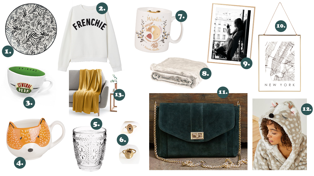 - Assiettes feuilles Maisons du Monde • 2. Sweat « Frenchie » H&M • 3. Mug « Friends • 4. Tasse renard Maisons du Monde • 5. Verres Maisons du monde • 6. Bagues Icier & Jolia Instants Plaisirs • 7. Tasse renard (oui, oui j’abuse hahaha) Maisons du Monde • 8. Plaid BigSweety Leroy Merlin (d’une douceur, vous n’imaginez même pas…) • 9. Cadre bois + cette affiche trop canon Desenio • 10. Cadre New York Maisons du Monde • 11. Sac vert Boutique Libertie modèle Mahé • 12. Peignoir tout doux biche Kiabi • 13. Plaid moutarde La Redoute