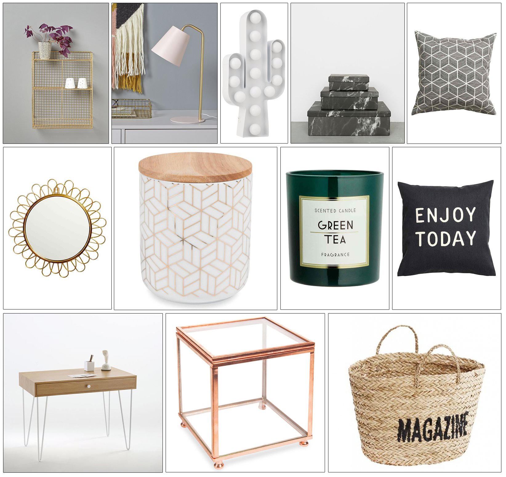 Etagère dorée Cyrillus Home • Lampe rose & dorée Cyrillus Home • Lampe cactus Hema • Boîtes marbrées Pimkie • Coussins gris H&M • Miroir soleil H&M • Boîte faïence Maisons du Monde • Bougie « Green tea » H&M • Coussins « Enjoy today » H&M • Bureau La Redoute • Boîte cuivrée Maisons du Monde • Panier magazine Pretty Wire