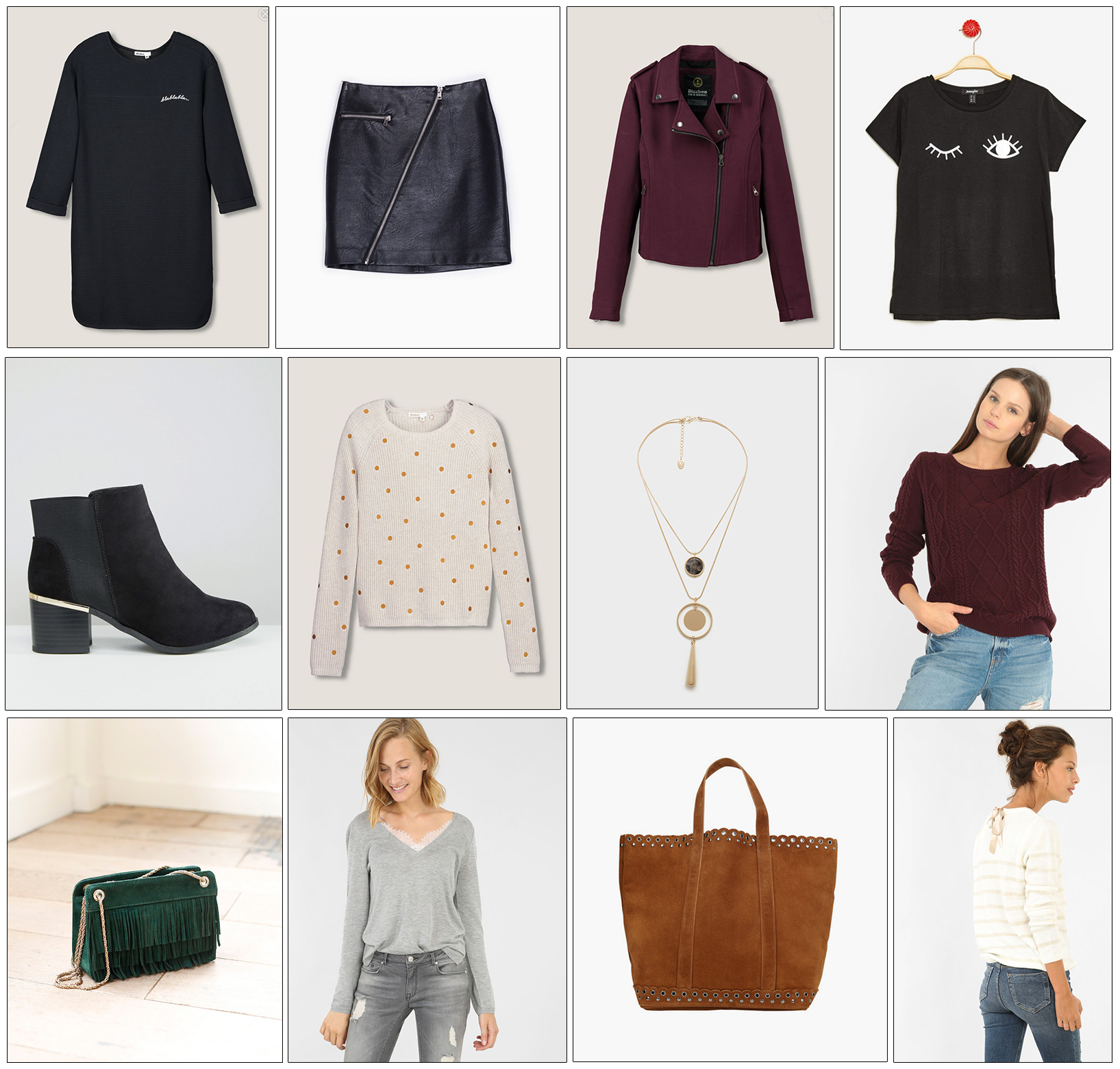 Robe sweat « Blablabla » Bizzbee • Jupe simili zipée Stradivarius • Perfecto bordeaux Bizzbee • T-shirt cils Jennyfer • Bottines Asos • Pull pois doré Bizzbee • Collier multi rangs Mango • Pull bordeaux Pimkie • Sac vert « Michelle » Sézane • Pull dentelle Pimkie • Cabas suédine Vanessa Bruno • Pull doré Pimkie